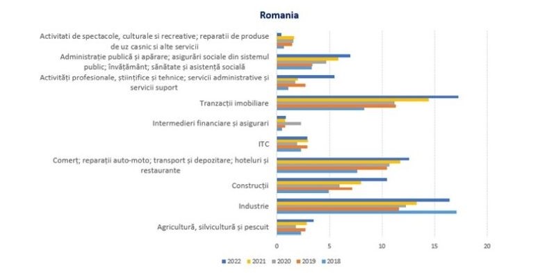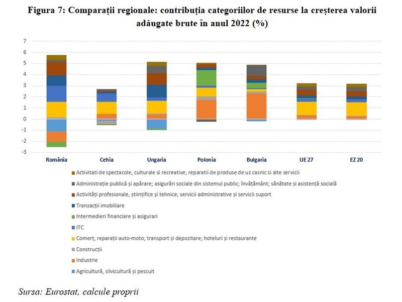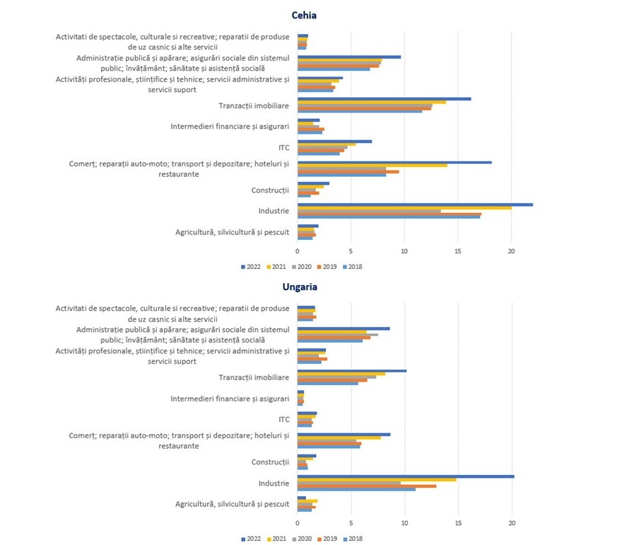 Din perspectiva contribuției nefavorabile a exporturilor nete la formarea PIB la care am făcut referire în comentariile pe marginea figurii anterioare, este de observat că investițiile în unele sectoarele importante de activitate care contribuie la oferta de bunuri și servicii ce pot fi comercializate la nivel internațional și care, implicit, pot substitui importurile („tradables”), sunt mai mici în România decât în Cehia (și în unele cazuri chiar și decât Ungaria). Chiar dacă investițiile în sectorul construcțiilor au rolul lor și contribuie (în cazul construcțiilor de infrastructură) la dezvoltarea economiei și la recuperarea unor decalaje existente, România trebuie totuși să nu rămână în urma regiunii din perspectiva investițiilor în sectoarele productive.Ca economiști, suntem cu toții conștienți de rolul de antrenare pe care îl au inclusiv construcțiile de locuințe și clădiri comerciale, precum și tranzacțiile imobiliare, asupra economiei și producției în ansamblu. Cred însă că prin mixul de politici nu trebuie lăsat ca acestea să aibă un efect indirect de diminuare („crowding out”) a investițiilor în dezvoltarea și creșterea competitivității ofertei de bunuri mobile și servicii tranzacționabile internațional. Avem în România o problemă structurală pe partea de ofertă care conduce la un dezechilibru extern, iar aceasta nu poate fi ameliorată dacă investițiile productive nu sunt stimulate prin balansul politicilor economice să se plaseze în primul plan.Consider că ideea de mai sus este susținută de o serie de observații ce pot fi formulate în urma analizei Figurii 3 de mai jos care prezintă pentru anul 2022 contribuția (exprimată procentual) la valoarea adăugată brută (cea mai importantă componentă a PIB pe partea de ofertă) a acelorași sectoare de activitate.
