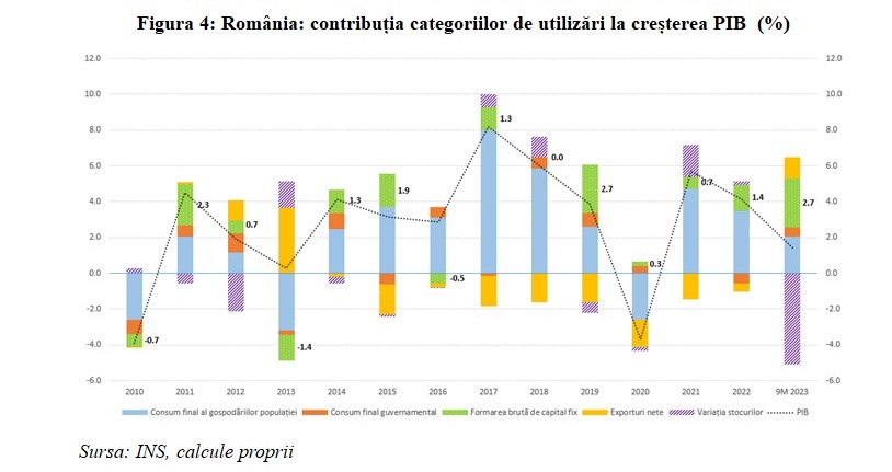 Al doilea aspect este că, încetinirea consumului în primele trei trimestre ale anului 2023 a fost contracarată parțial de aportul favorabil al exporturilor nete (pentru prima dată în ultimii aproximativ 10 ani) și într-o măsură importantă de investiții. Deși benefic și îmbucurător, aportul exporturilor nete este însă posibil să nu poată fi menținut în perioada următoare, pentru că există transformări importante la nivel global care deocamdată acționează cu multă forță în sens nefavorabil schimburilor internaționale (tensiuni geopolitice, reamplificarea protecționismului, încetinire economică în Europa și în China etc). Așadar trebuie să putem conta în continuare pe revenirea consumului. În același timp, investițiile sunt necesare pentru adaptarea economiei la noile condiții și pentru implementarea avansului tehnologic foarte accelerat din ultimii ani. Mai mult, ele sunt susținute de importante programe de finanțare la nivel european. Așadar avem motivații foarte puternice pentru a realiza toate eforturile necesare astfel încât, după performanța foarte bună a investițiilor din primele trei trimestre ale anului trecut, acestea să nu încetinească semnificativ în anul 2024.