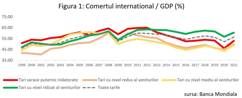 Tot în Figura 1 se observă că, în termeni relativi, țările sărace sau puternic îndatorate au cunoscut un declin mult mai puternic al activității de comerț exterior, situându-se în permanență după anul 2012 la un nivel inferior în raport cu țările caracterizate de un nivel ridicat al veniturilor (conform clasificării și datelor Băncii Mondiale).