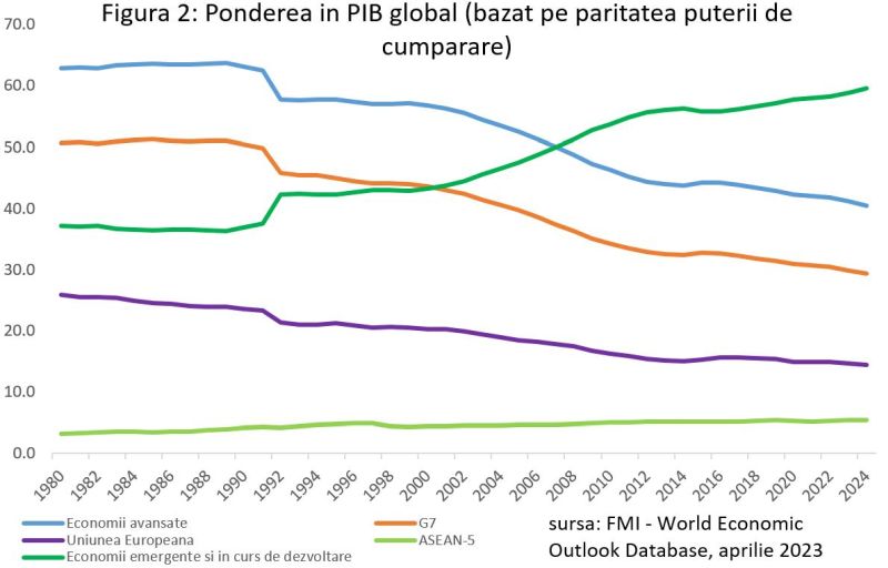 Totuși, o categorie aparte, formată din țări aflate între extrema celor cu nivel de dezvoltare economică foarte redus și extrema țărilor foarte dezvoltate, respectiv economiile emergente și în curs de dezvoltare, a cunoscut o creștere semnificativă a puterii economice în termeni relativi. Figura 2 ilustrează faptul că economiile emergente și în curs de dezvoltare și-au sporit semnificativ contribuția la PIB-ul global pe parcursul ultimilor 35 de ani, în detrimentul economiilor dezvoltate, sau al unor blocuri economice avansate precum G7 sau Uniunea Europeană.