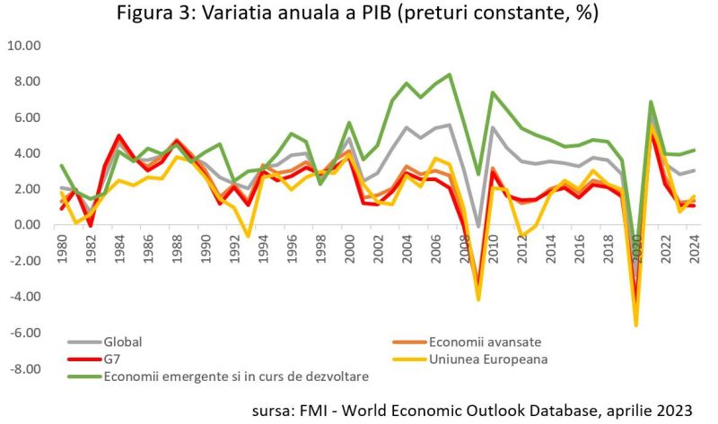 Totodată, Figura 3 arată că de la intrarea în mileniul actual, grupul economiilor emergente și în curs de dezvoltare a consemnat cu regularitate rate anuale de creștere economică mai mari în comparație cu grupul economiilor avansate, cu blocul G7 sau Uniunea Europeană. Această situație mai favorabilă în termeni relativi pentru grupul țărilor cu economie emergentă și în curs de dezvoltare s-a menținut chiar și în anii 2009 și 2020, de scădere economică în zonele dezvoltate și la nivel global.
