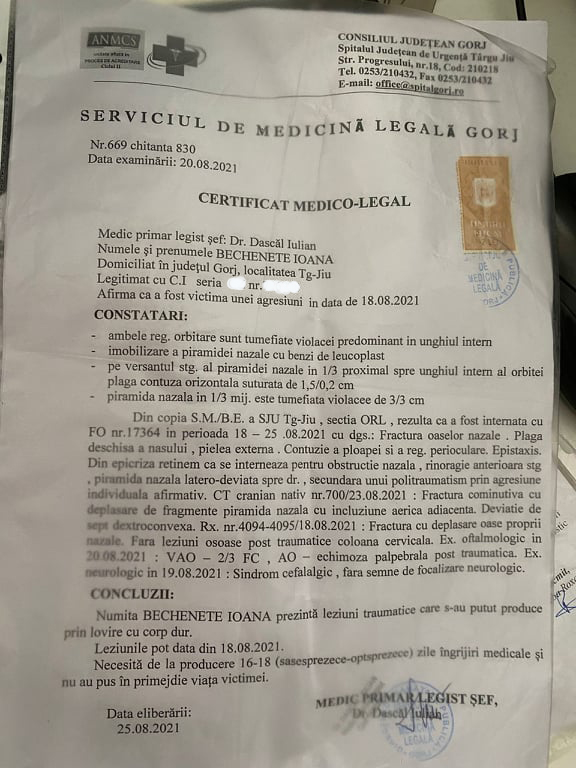 Certificatul medico-legal eliberat de SML Târgu Jiu demonstrează, fără echivoc, că Ioana Bechenete a fost snopită în bătaie de către Ion Cosmin Vîlceanu, vărul actualului ministru al Finanțelor. Șocant este că, după aceste dovezi medicale, respectivul este în libertate, deoarece situația de la Cîlnic nu este prea departe de cel al femeilor care au făcut circ în centrul municipiului Târgu Jiu, pe 24 august, acestea fiind reținute de anchetatori, după ce, inițial, IPJ Gorj nu a dat niciun fel de importanță cazului care a șocat întreaga comunitate. Ion Cosmin Vîlceanu este acuzat că a lovit cu bestialitate această femeie, învinețindu-i fața, spărgându-i nasul și băgând-o pe aceasta în spital pentru opt zile.