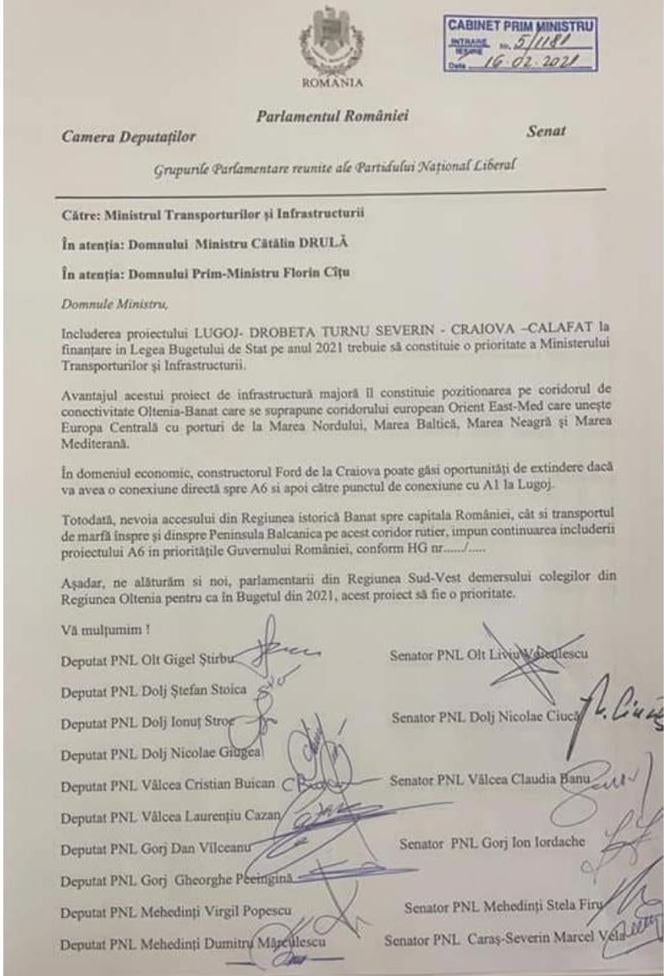 Adresa prin care se cere suplimentarea bugetului Ministerului Transporturilor pentru demararea studiului de fezabilitate în vederea realizării unui drum expres care să lege Lugojul de Calafat este semnată și de cei trei parlamentari PNL de Gorj, Dan Vîlceanu, Gheorghe Pecingină și Ion Iordache.