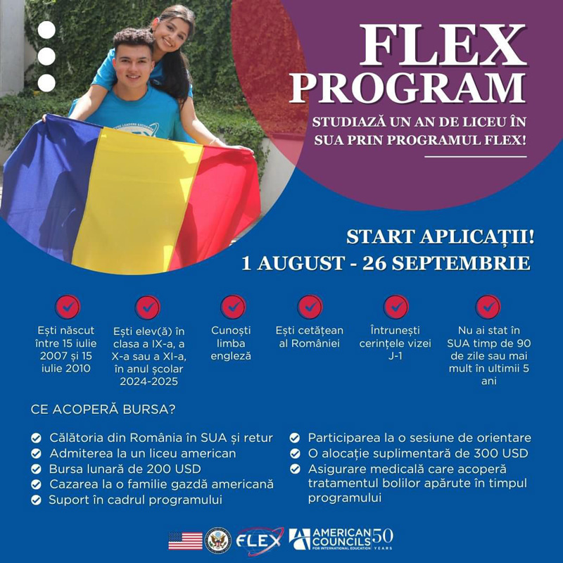 Ambasada Statelor Unite ale Americii în România, Ministerul Educației și American Councils for International Education România lansează tuturor liceenilor români invitația de a se înscrie la programul FLEX 2025. Programul FLEX (Future Leaders Exchange) se desfășoară pentru a noua oară în țara noastră și își propune selectarea unui număr de 30 de elevi români care, complet gratuit, vor avea oportunitatea de a studia, pe parcursul anului școlar 2025-2026, într-un liceu american, locuind, în tot acest timp, împreună cu o familie-gazdă americană.