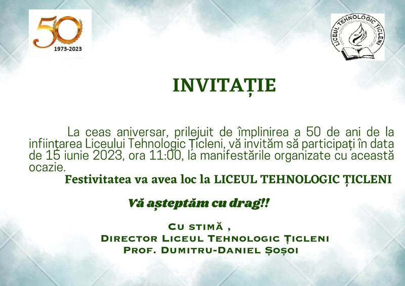Liceul Tehnologic Țicleni împlinește, la jumătatea acestei luni, cinci decenii de activitate. Aniversarea celor 50 de ani este prilej de bucurie pentru conducerea unității de învățământ, pentru elevi dar și pentru cadrele didactice. Momentul va fi sărbătorit, așa cum se cuvine, pe 15 iunie, cu începere de la orele 11.00 când, în incinta liceului, sunt invitați foștii profesori, foștii elevi și cei care au pus umărul la dezvoltarea acestei unități de învățământ etalon pentru zona Țicleni și pentru județul Gorj. Directorul unității de învățământ, prof. Daniel Dumitru Șoșoi, anunță că vor fi organizate manifestări cu acest prilej și o festivitate la un înalt nivel.