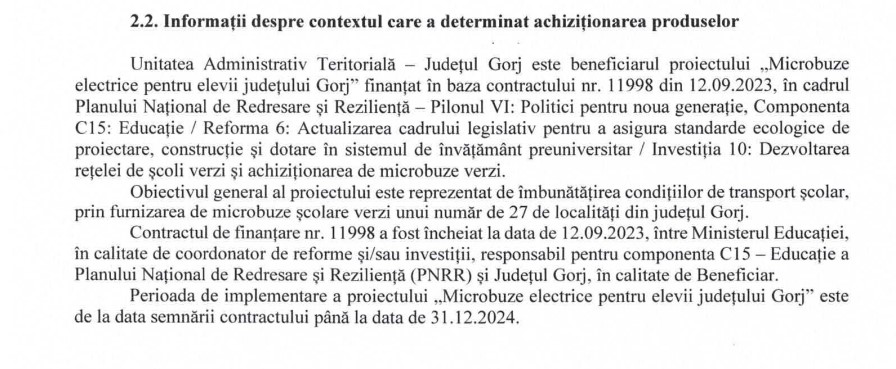 „Achiziția microbuzelor electrice va genera un impact minim asupra mediului înconjurător, prin diminuarea atât a emisiilor poluante, cât și a gradului de poluare fonică, ținând cont de faptul că autovehiculele electrice sunt mult mai silențioase în comparație cu cele care utilizează alt tip de combustibil. Achiziția de microbuze electrice pentru asigurarea transportului școlar va crea o siguranță sporită atât pentru șoferi și elevii pasageri, cât și pentru ceilalți participanți la trafic, întrucât microbuzele electrice ce vor fi achiziționate vor beneficia de tehnologii de siguranță modernă, care oferă asistență șoferului pentru evitarea unor situații care pot conduce la accidente rutiere”, potrivit documentației aferente licitației.
