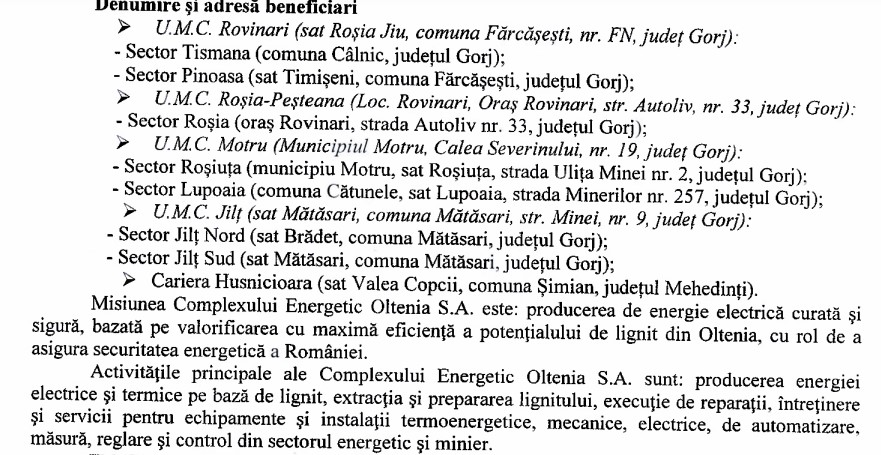 Piesele vor ajunge în carierele miniere din Gorj și Mehedinți. „Se solicită achiziţia pieselor de schimb pentru activitatea de întreţinere şi reparare cu forţe proprii a mecanismelor de marş, a sistemelor de susţinere şi deplasare a construcţiei benzii 3/banda 2 ale utilajelor de mare capacitate (excavatoare, maşini de haldat, cărucioare cu bandă pe şenile), aparţinând carierelor de lignit din cadrul Sucursalei Miniere. Mecanismele de marș asigură deplasarea utilajelor de mare capacitate atât în timpul funcționării, cât și deplasarea acestora de la un front de lucru la altul”, se precizează în caietul de sarcini.