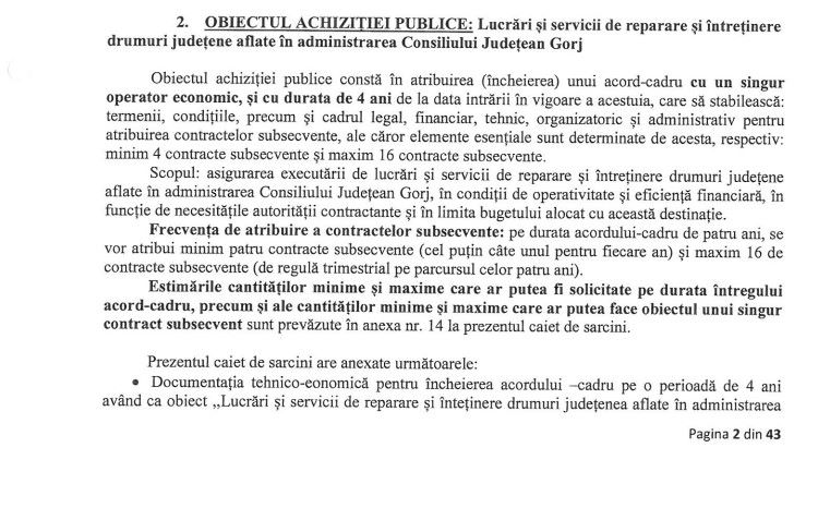 Consiliul Județean Gorj a scos la licitație lucrările și serviciile de reparare și întreținere a drumurilor județene. Se dorește încheierea unui acord-cadru, pe patru ani, cu un singur operator economic. Valoarea maximă estimată a contractului depășește 36 de milioane de euro fără TVA.