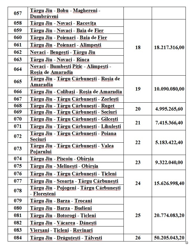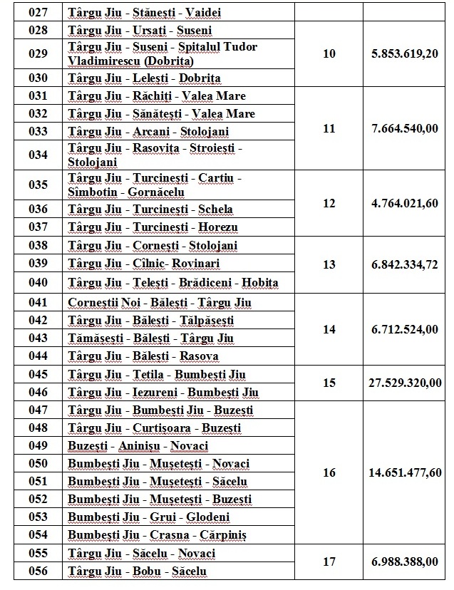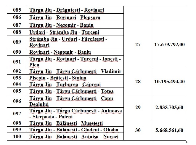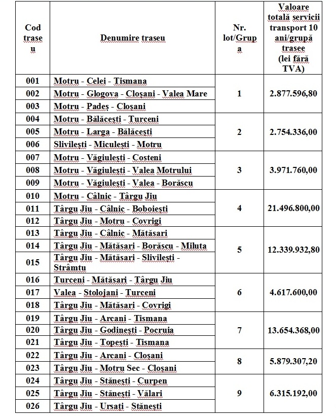 Consiliul Județean Gorj organizează o licitație deschisă pentru delegarea gestiunii serviciului public de transport județean de persoane prin curse regulate, cu autobuze și microbuze, pe teritoriul judeţului. Contractul este împărțit în 30 de loturi și are o valoare estimată la 333.122.287 lei, fără TVA, adică peste 67 de milioane de euro. Durata contractului va fi de 10 ani.