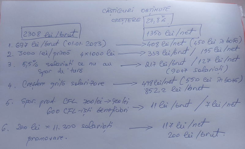 Cifrele negociate până acum privind viitoarele majorări ale veniturilor salariaților CEO sunt următoarele: 450 lei pe grilă, de la 01.01.2023 și un plus de 550 lei de la 01.04.2023; 4 prime de 3000 lei, 200 lei fond promovare mediu/salariat, spor de 5,5% pentru cei care nu au spor de tură, iar sporul de producție CFL, 900 lei, plus majorarea sporului de producție pentru subteran.
