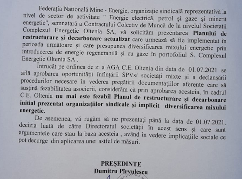 Dumitru Pîrvulescu mai arată că, în condițiile în care se pun bazele unor astfel de parteneriate despre care nimeni nu ştie nimic şi pentru care acţionarii se vor întruni la data de 1 iulie pentru a aproba demersurile pentru înfiinţarea societăţilor mixte, „planul de restructurare şi decarbonare iniţial, prezentat organizațiilor sindicale şi, implicit, diversificarea mixului energetic, nu mai este fezabil”. Cu alte cuvinte, înțelegerea de până acum, între administrația CEO şi organizațiile sindicale afiliate FNME, a picat.