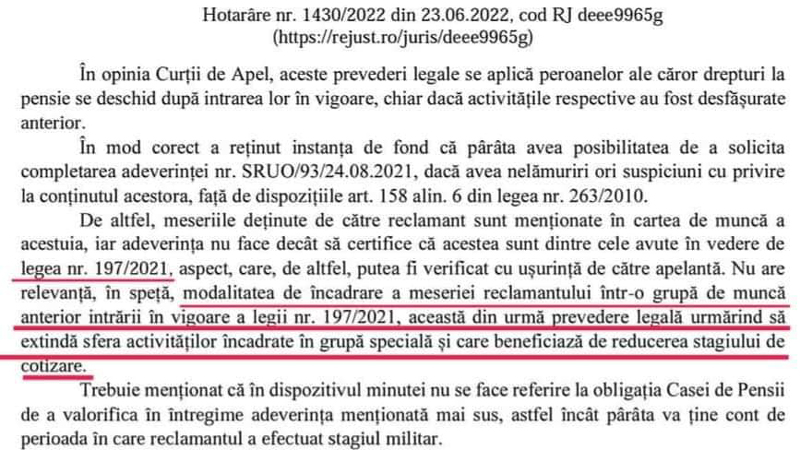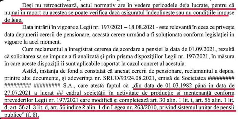 Liderul face referire la articolul din Legea 197 care vizează activitățile din producție, nu la condițiile în care lucrează, de zeci de ani, salariații CEO. Mai exact: ,,În lege scrie clar că prevederile ei se aplică oamenilor care au lucrat efectiv în producție și nu de grupele de muncă ci strict de activitățile specifice în care am lucrat decenii întregi. Faptul că se face trimitere la orice altceva și nu în direcția Legii 197, mie mi se pare o manipulare crasă. Dar, ce să va spun, salariații trebuie bulversați în așa fel încât să nu mai poată separa adevărul de minciună, să nu mai știe ce să creadă. Dacă Legea 197 ar fi aplicată în integralitatea ei, nu ar mai exista niciun fel de probleme și nicio nebuloasă. Numai că este extrem de clar că nu se vrea. Pe scurt, judecătorii dau vina pe pe casele de pensii, acestea dau vina pe CEO și invers, în așa fel încât legea 197 să rămână neaplicată”.