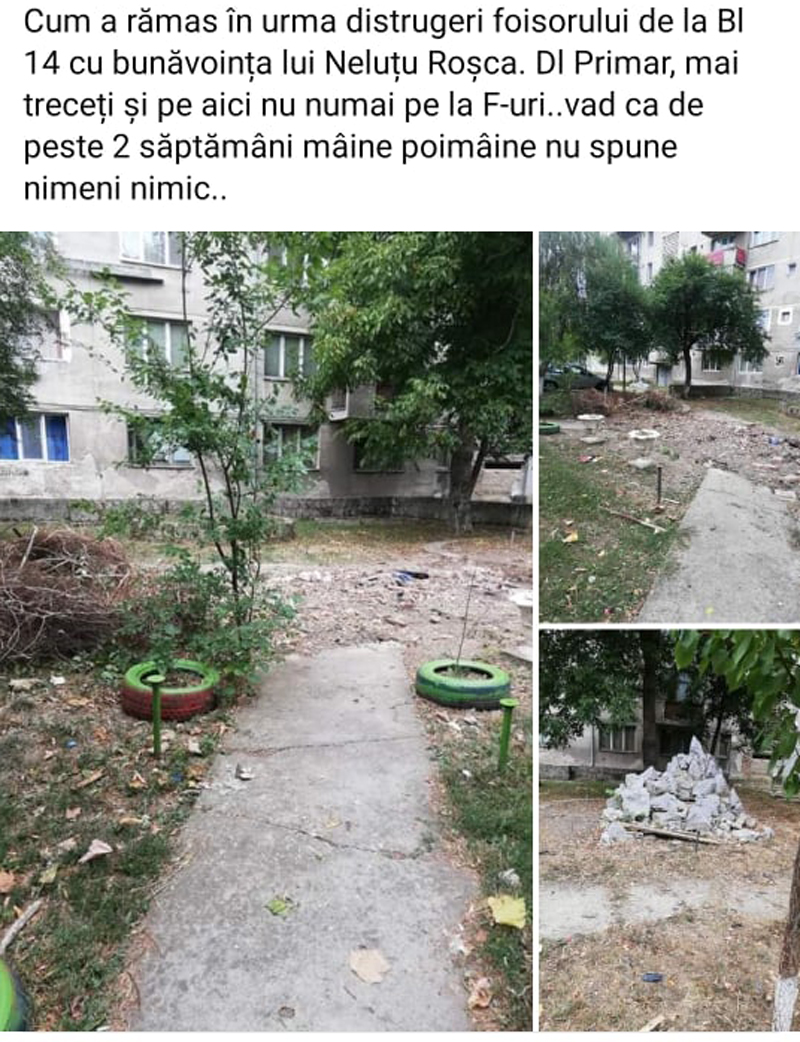 ,,Cum a rămas în urma distrugeri foișorului de la Bl. 14, cu bunăvoința lui Neluțu Roșca. Dl Primar, mai treceți și pe aici, nu numai pe la F-uri. Văd că de peste 2 săptămâni nu spune nimeni nimic..”, a scris un locatar pe Facebook.