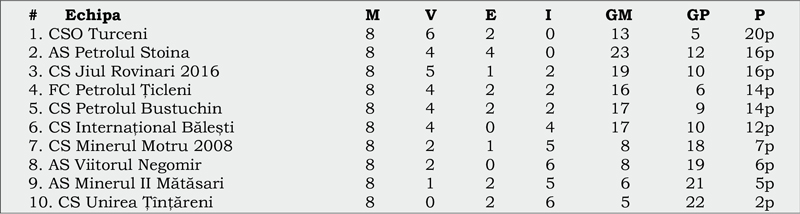 CSO Turceni a reuşit o nouă victorie importantă în runda cu numărul opt a ligii a patra. Trupa condusă de Viorel Cojocaru s-a impus, pe teren propriu, împotriva Jiului Rovinari.