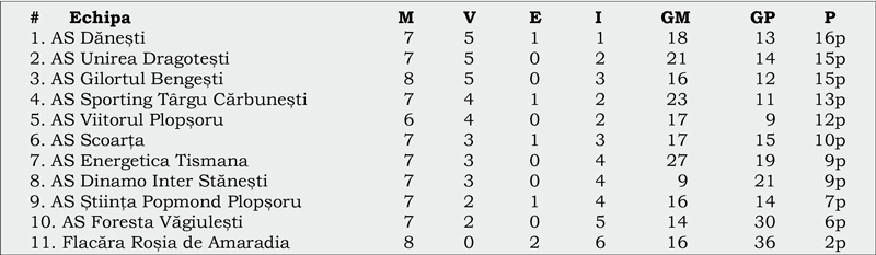 Cealaltă echipă neînvinsă a seriei, AS Petrolul Stoina, a urcat pe poziţia secundă, după un succes concludent cu Minerul Motru. Totuşi, scorul etapei s-a consemnat la Ţicleni, unde Petrolul i-a administrat un ,,set” Unirii Țînțăreni. Meciuri cu foarte multe goluri au avut loc şi la Liga 5. Inter Stănești a plecat cu sacul plin de pe Stadionul ,,Cristinel Răducan”, iar, la Dăneşti, echipa din Roşia de Amaradia a fost învinsă după un duel spectaculos.