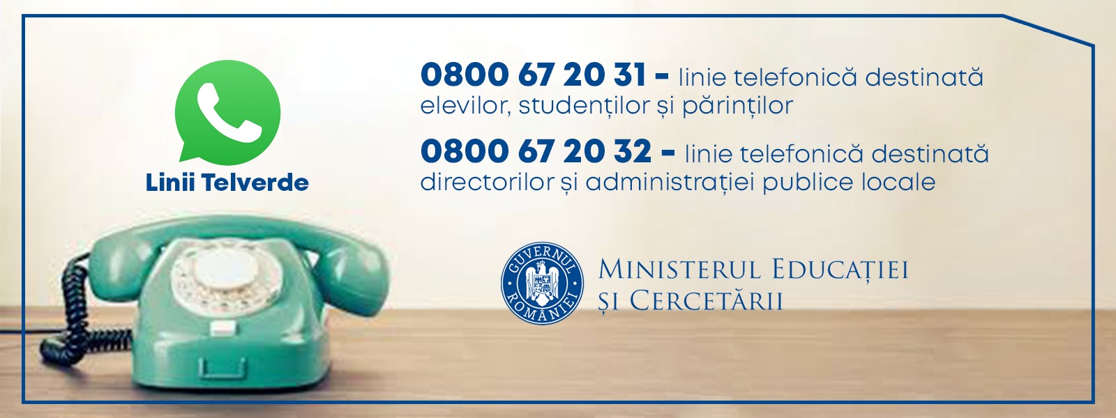 Ministerul Educației și Cercetării pune la dispoziția celor interesați de informații legate de contextul educativ și sanitar în care se va desfășura activitatea didactică în anul școlar/universitar 2020-2021 două linii Telverde. O linie Telverde – 0800 67 20 31 – va fi pusă la dispoziția elevilor, studenților și părinților, în vederea obținerii de informații privind reluarea/desfășurarea procesului instructiv-educativ, în timp ce a doua linie Telverde – 0800 67 20 32 – va fi destinată reprezentanților unităților de învățământ preuniversitar de stat și administrației publice locale, cu scopul de a oferi consultanță în materie de accesare a fondurilor europene prevăzute prin OUG nr. 144/2020.