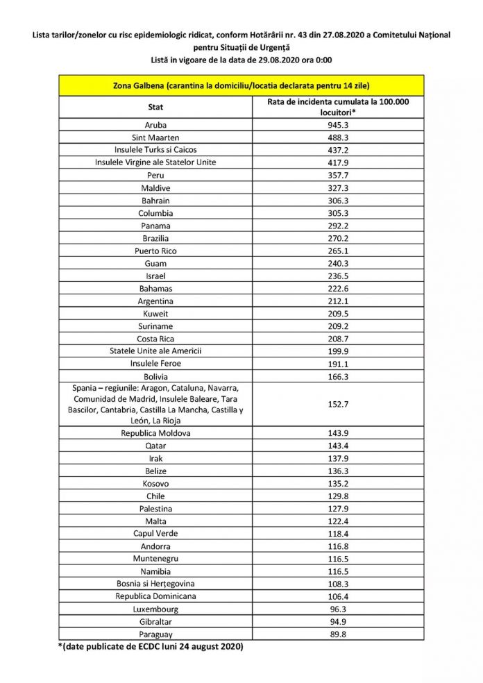 Lista State cu risc epidemiologic ridicat 29.08.2020
