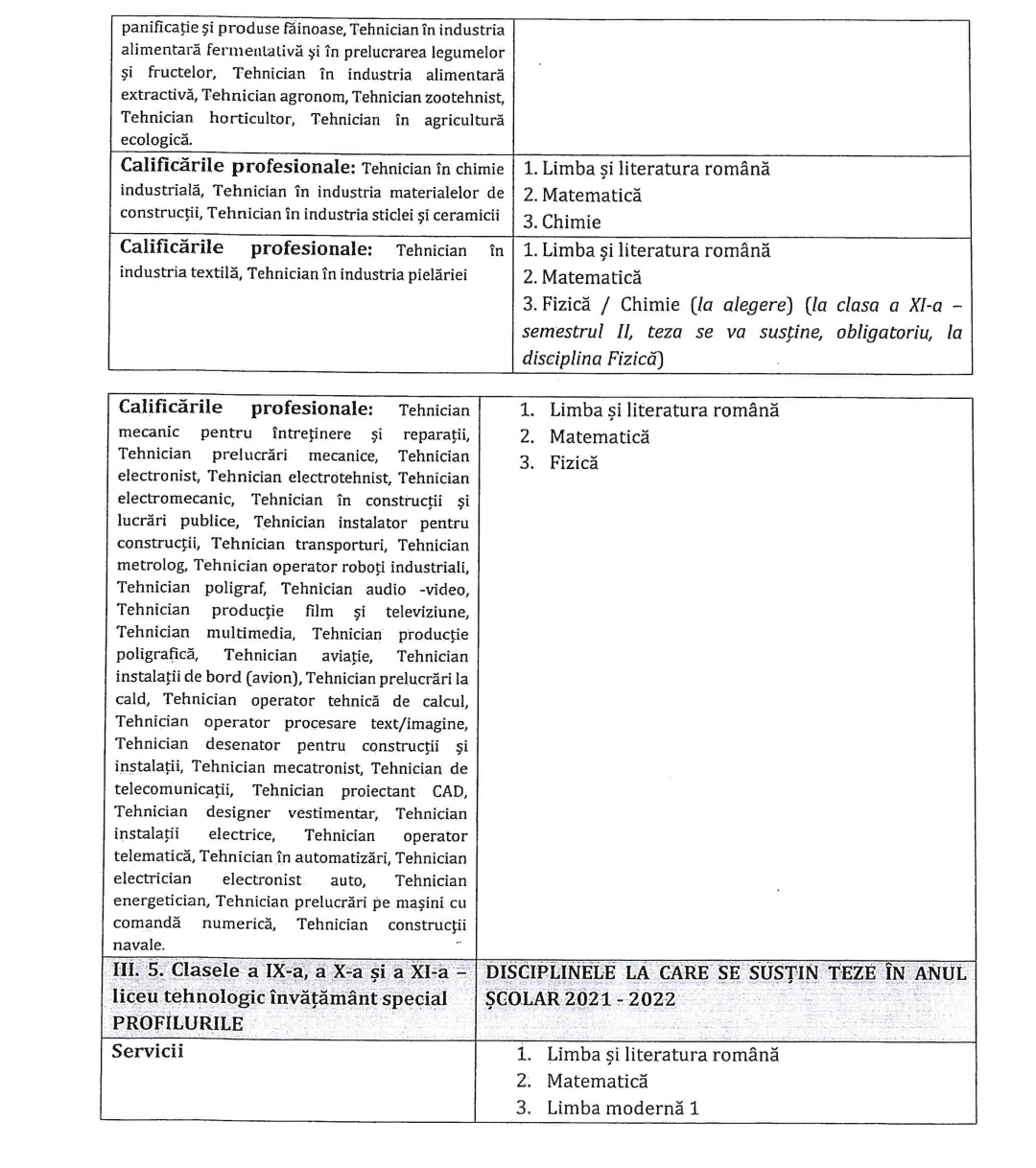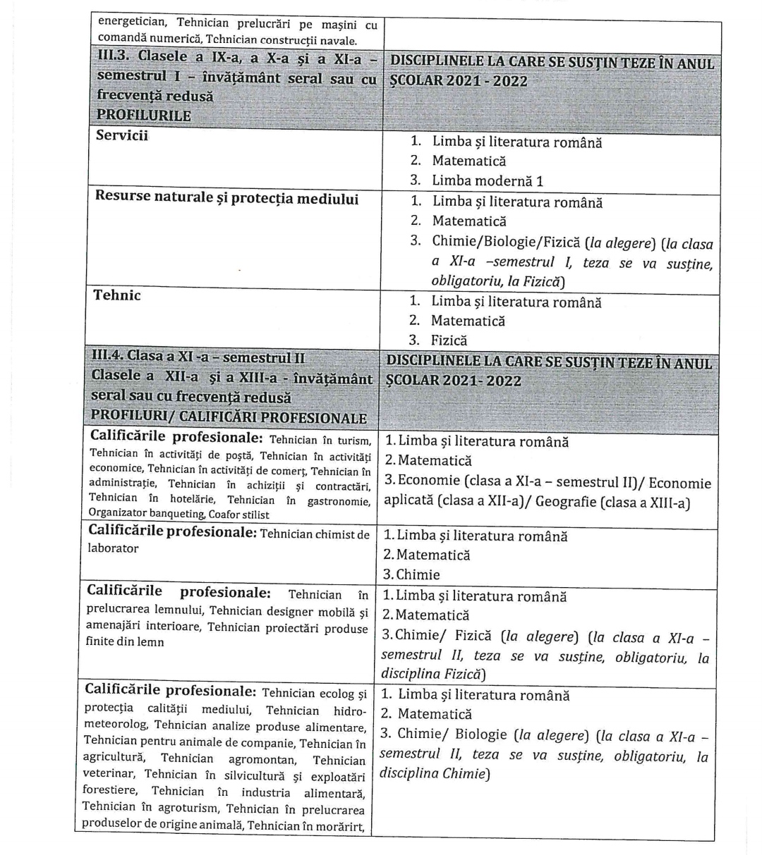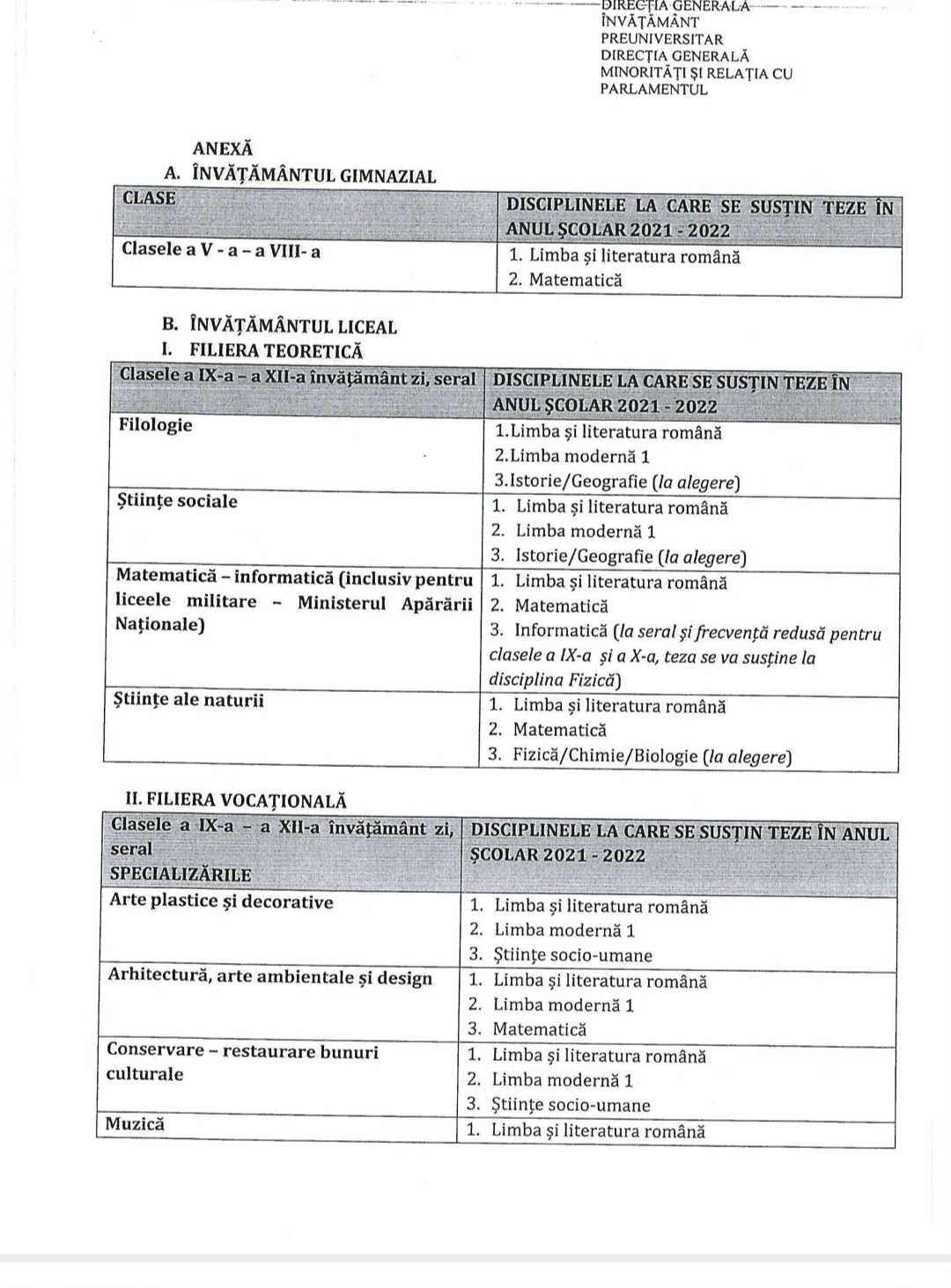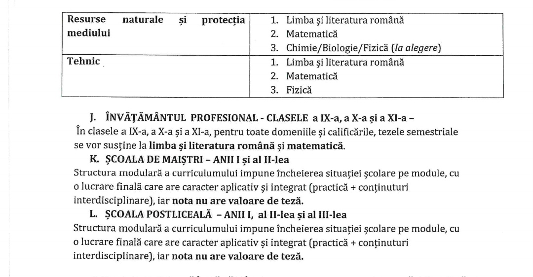 „În baza prevederilor Regulamentului-cadru de organizare și funcționare a unităților de învățământ preuniversitar aprobat prin OMEC nr. 5447/2020, cu modificările și completările ulterioare, disciplinele la care se susțin lucrări scrise de evaluare semestrială (teze) se stabilesc de către Ministerul Educației.