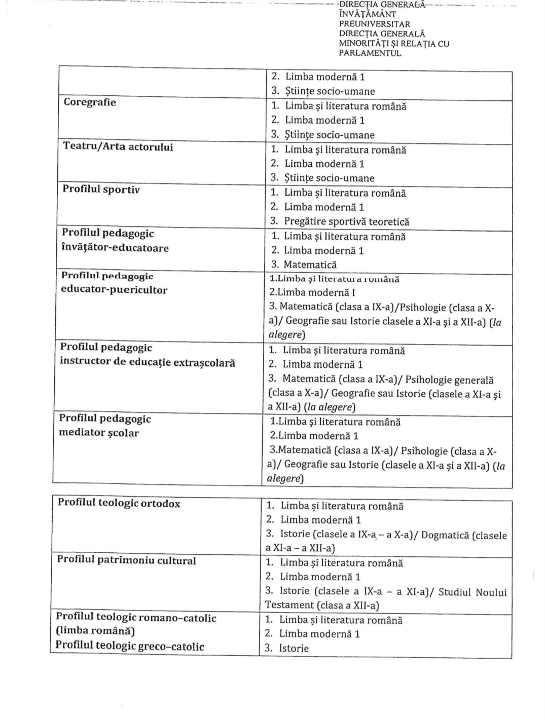 La unitățile de învățământ gimnazial, liceal și profesional cu predare în limbile minorităților naționale, precum și la clasele de nivel gimnazial, liceal și profesional cu predare în limbile minorităților naționale, pe lângă lucrările scrise menționați în listă, se susține lucrare scrisă semestrială și la limba şi literatura maternă, indiferent de nivel, filieră, profil, specializare/calificare profesională, an de studiu și formă de școlarizăre.