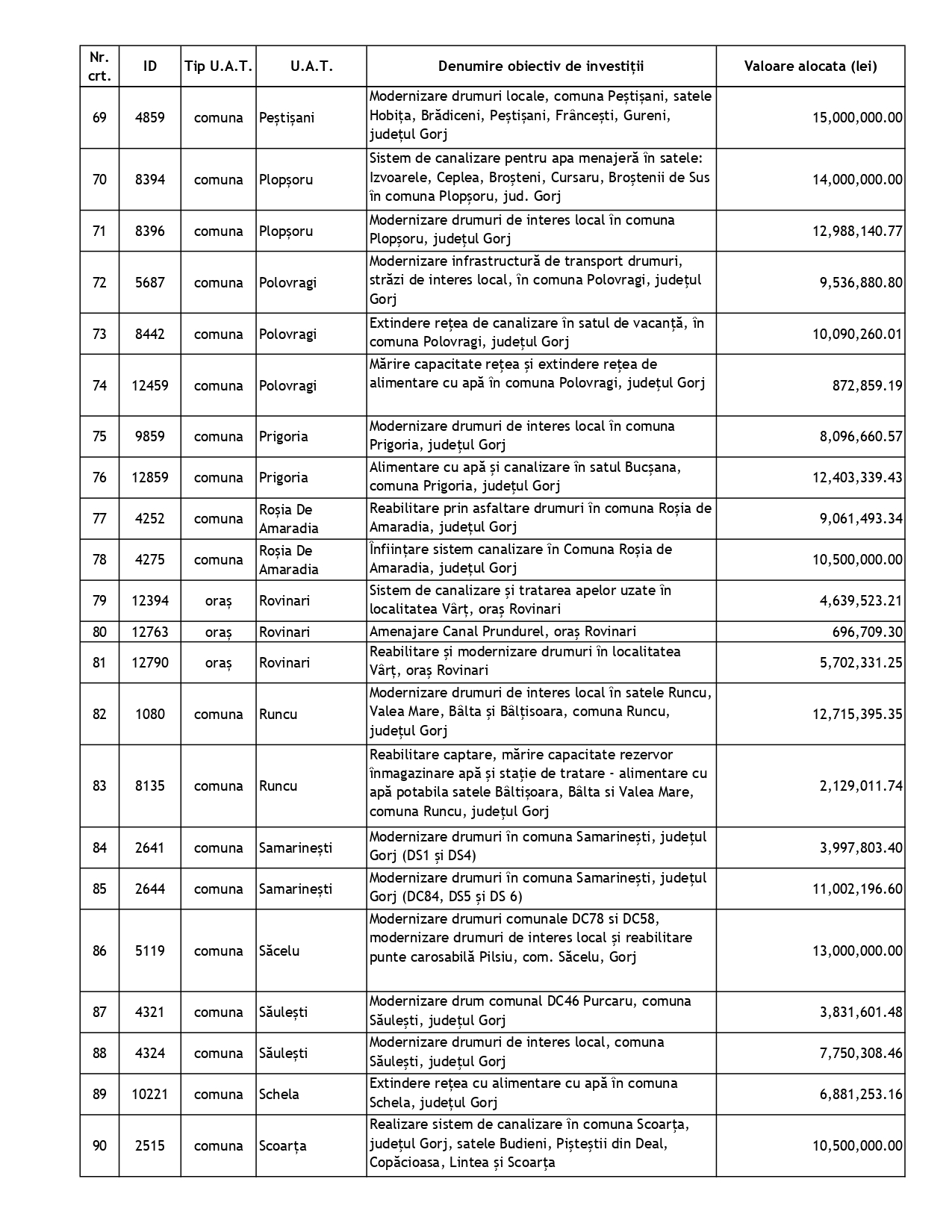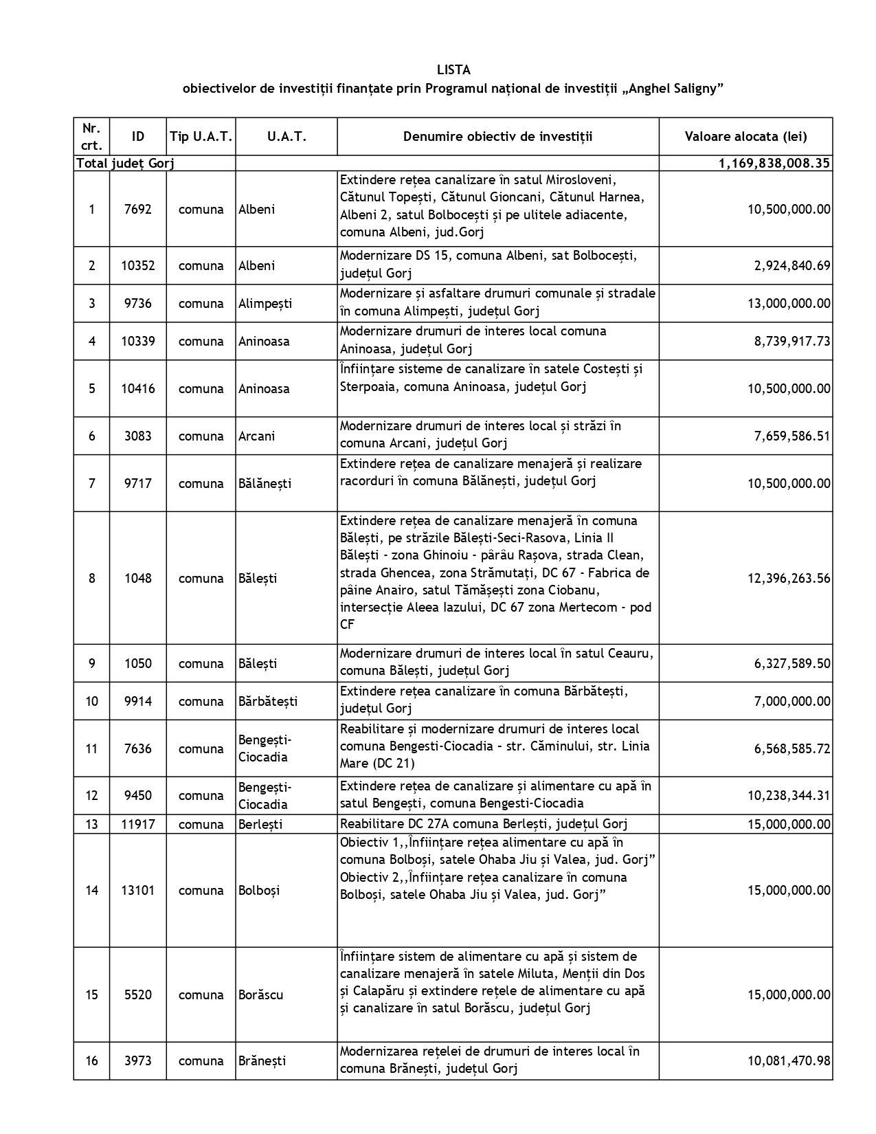 Nu mai puțin de 114 proiecte au fost aprobate în județul Gorj prin programul „Anghel Saligny”. Primăriile și Consiliul Județean vor primi finanțare pentru investiții în valoare totală de 1.169.838.008,35 lei. „Prioritare au fost, și de această dată, asigurarea apei potabile în localități și a rețelelor de canalizare, iar drumurile vor fi reabilitate doar dacă aceste două categorii de utilități sunt realizate. Îi asigur pe locuitori că fiecare localitate care a depus cerere va primi finanțare pentru cel puțin o investiție”, a anunțat ministrul Dezvoltării, Cseke Attila.