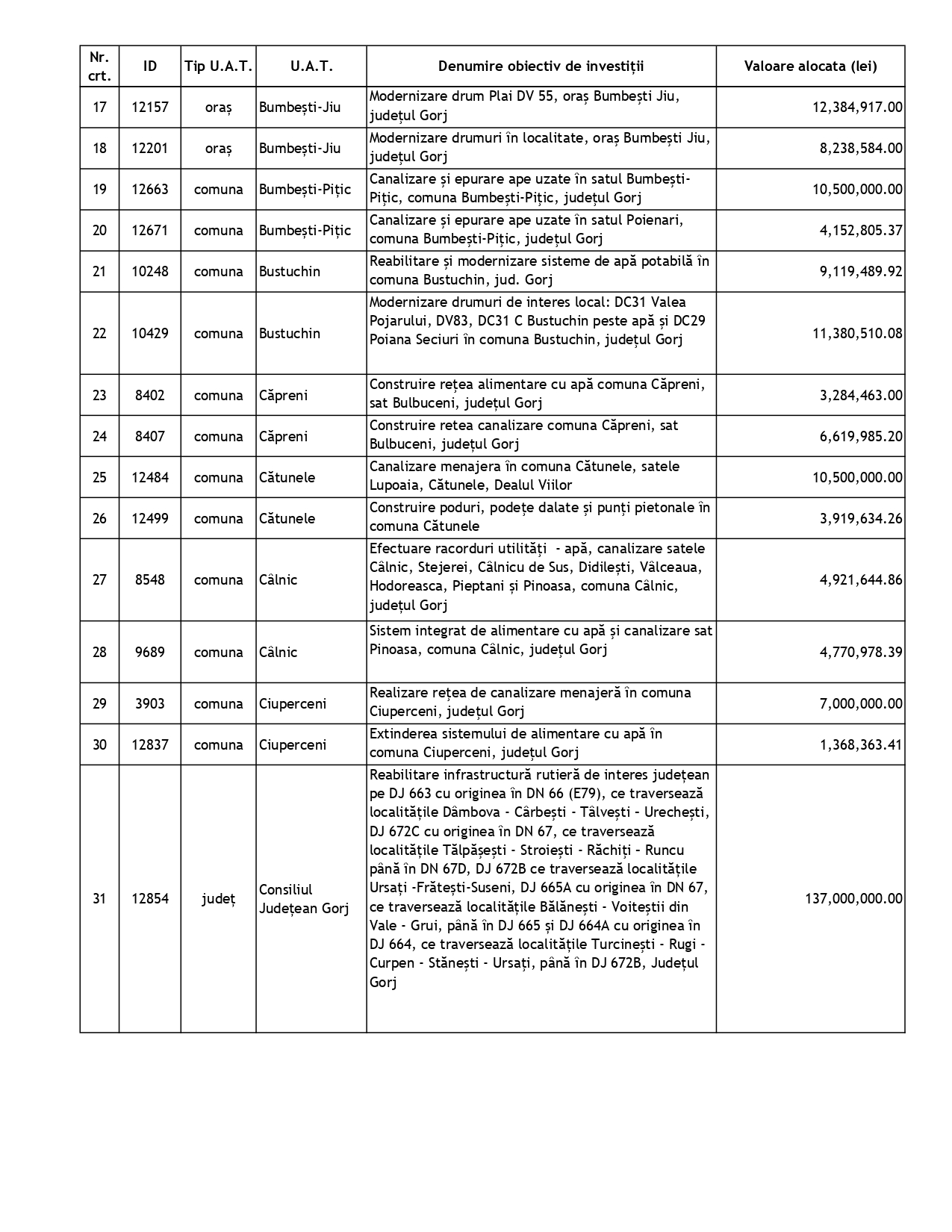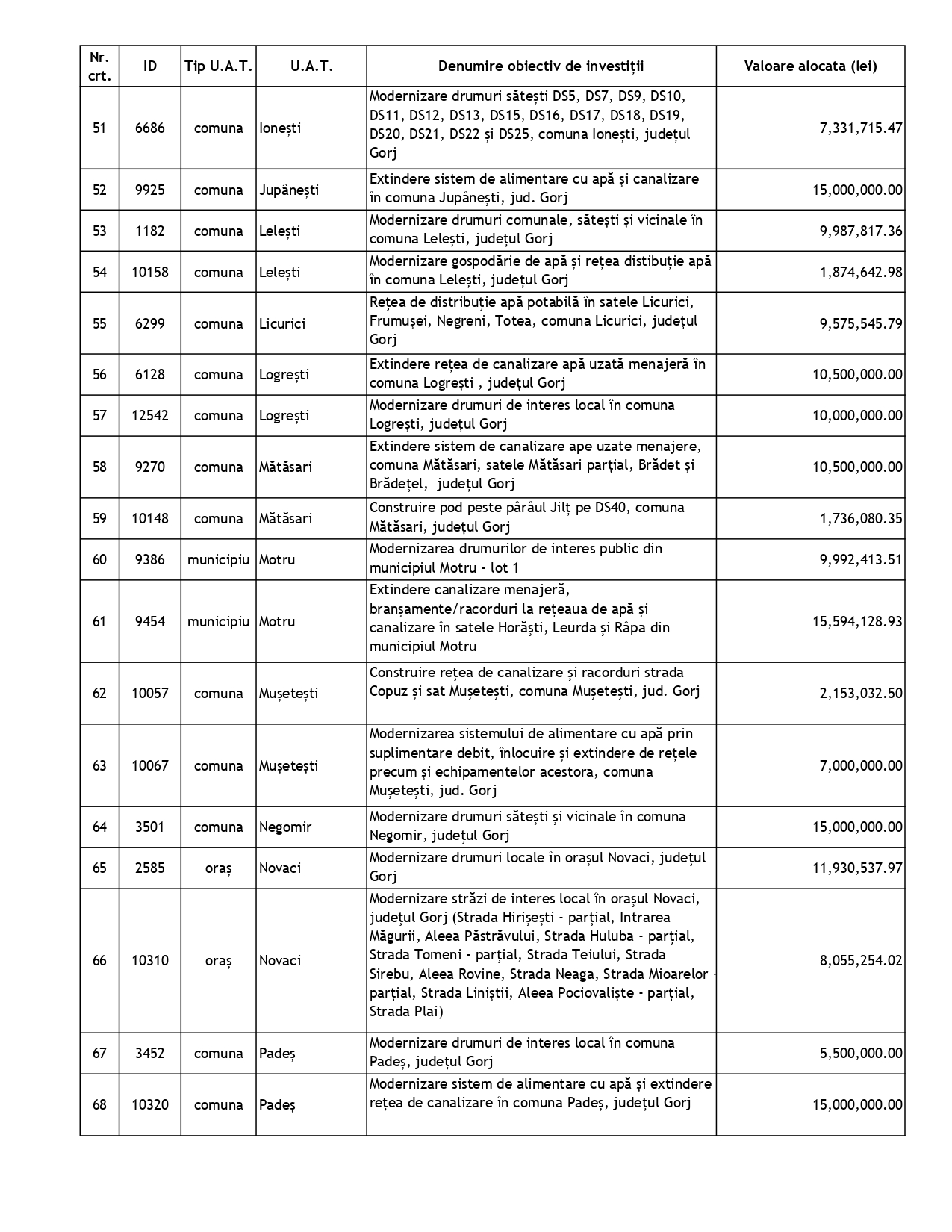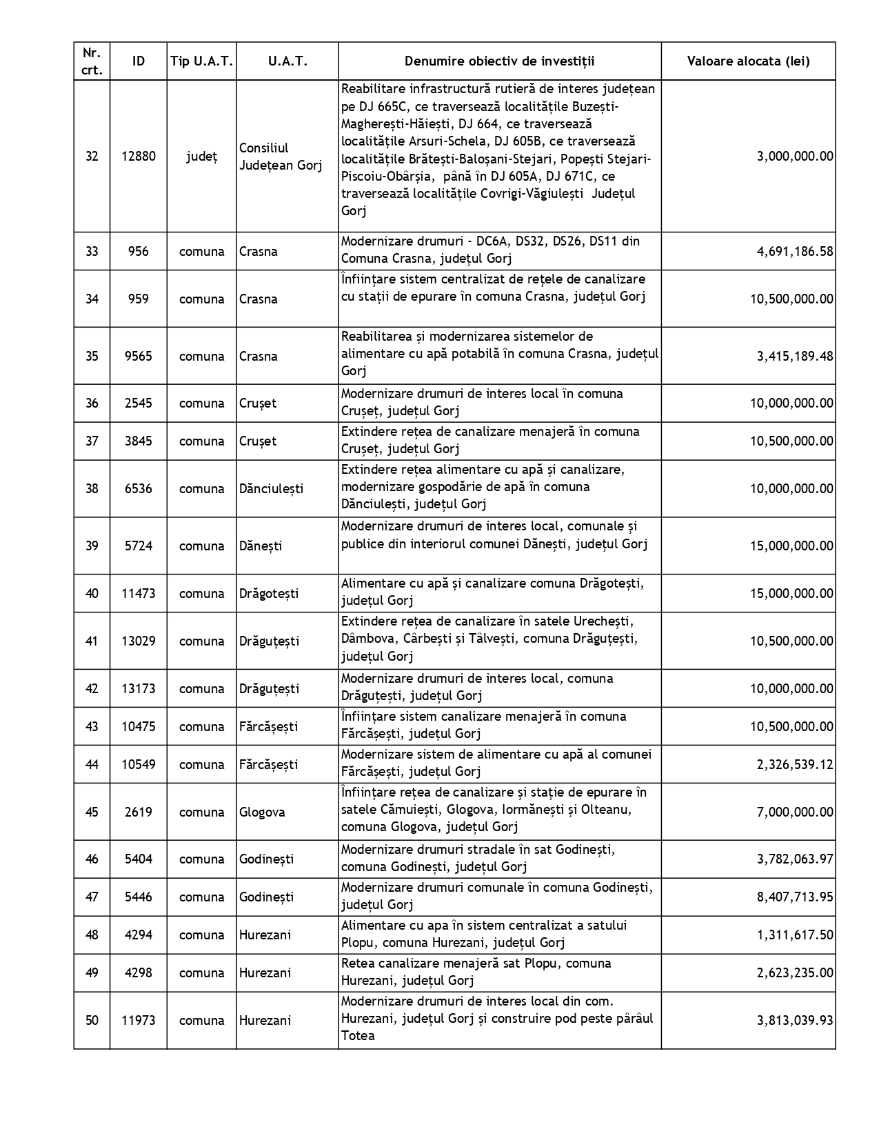 Investiții de peste 25 de milioane de lei au fost aprobate și pentru municipiul Motru. Este vorba de modernizarea unor drumuri și extindere canalizare menajeră, branşamente/racorduri la reţeaua de apă şi canalizare în satele Horăşti, Leurda şi Râpa. Pentru orașul Tismana va fi finanțat un proiect de 43 de milioane de lei, respectiv „Extindere rețea canalizare cu DN 250 – DN 400 în satele Gornovița, Racoți, Topești, Vâlcele, Vânăta, Sohodol”.