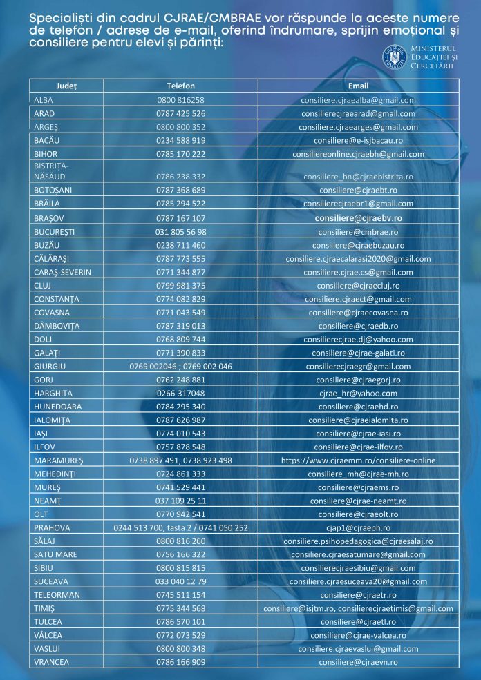 Ministerul Educației și Cercetării a publicat astăzi lista completă a tuturor liniilor telefonice de consiliere socio-emoțională pentru elevi și părinți, gestionate de specialiști CJRAE/CMBRAE. „Specialiștii din cadrul Centrelor Județene de Resurse și Asistență Educațională/Centrul Municipiului București de Resurse și Asistență Educațională (CJRAE/CMBRAE) vor oferi zilnic, de luni până vineri, în intervalul orar 8:00-16:00, consiliere psihologică pentru elevi și părinți. Aceștia vor fi consiliați pentru a gestiona mai ușor această perioadă în care este nevoie de îndrumare, sprijin emoțional și consiliere”, a anunțat MEC. Lista liniilor telefonice și adresele de e-mail alocate în acest sens, la nivelul fiecărui județ/Municipiului București, poate fi consultată pe site-ul Ministerului Educației, www.edu.ro.