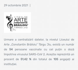 În randul liceelor codașe la vaccinare, și asta tot pentru unul sau doi profesori antivacciniști, se numără doar Liceul Tehnologic din Baia de Fier, Liceul Bumbești Jiu și, în mod șocant, Liceul de Arte din Târgu Jiu, singura unitate de acest fel de la nivelul municipiului. Mai precis, pentru un procent de vaccinare de 51,42% în rândul profesorilor din aceasta unitate, sute de elevi din această școală, elevi care învață instrument sau desen, stau acasă și învață on-line.