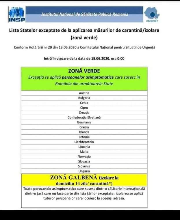 Lista statelor exceptate de la aplicarea măsurilor de carantină/izolare