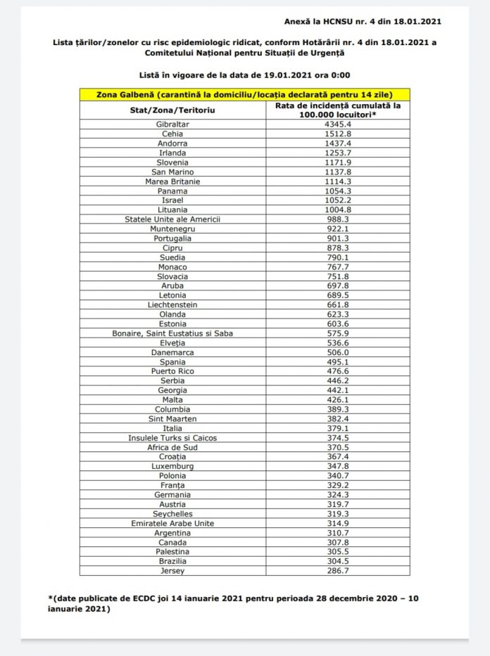 Comitetul Național pentru Situații de Urgență a actualizat luni lista țărilor cu risc epidemiologic ridicat, care a întrat în vigoare azi noapte, la ora 00.00.