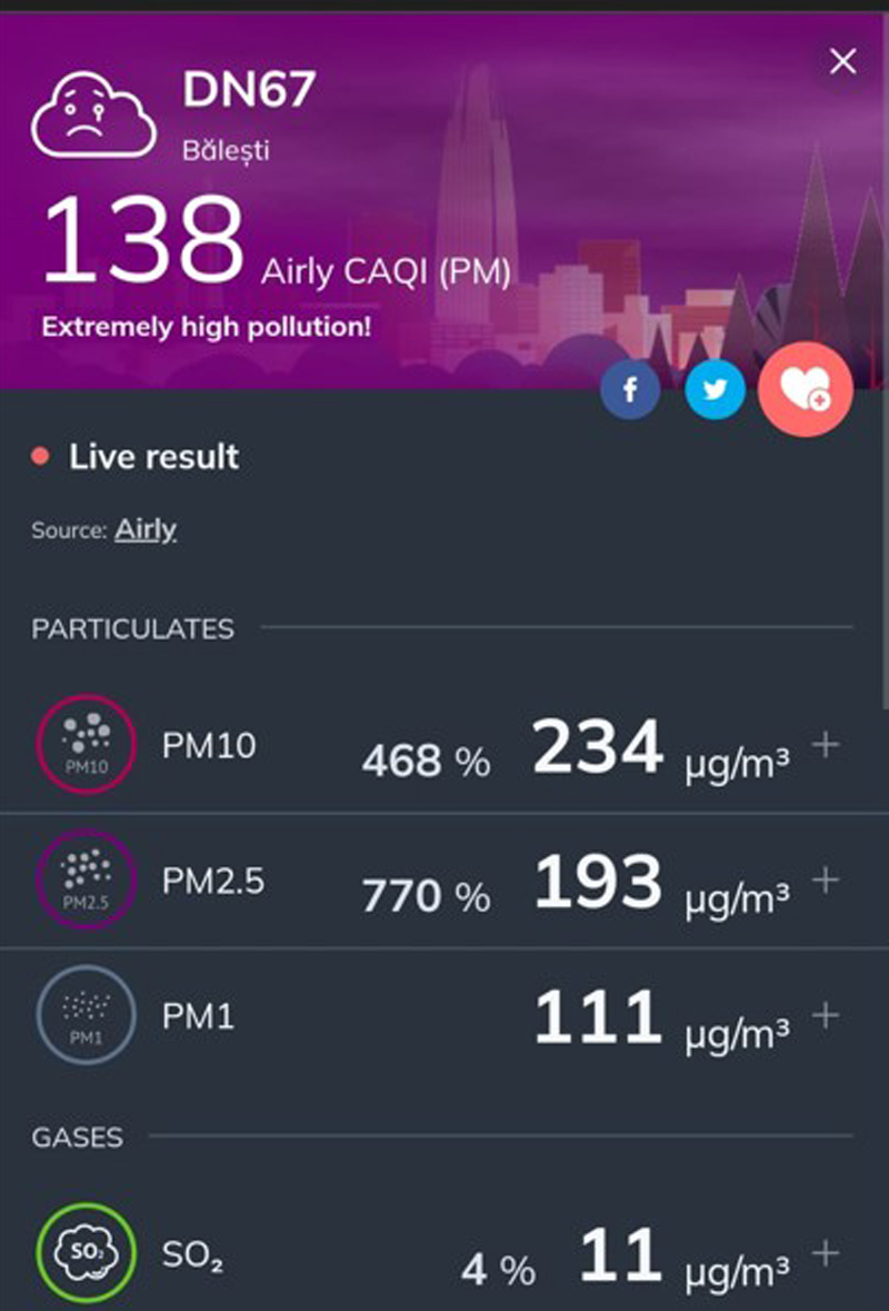 Potrivit monitorizării, în timp real, a calității aerului, chiar în Ajunul Crăciunului, cea mai poluată zonă din România a fost localitatea Bălești. Gradul de poluare arăta înfiorător, iar doi dintre markerii cheie de poluare, PM10 și PM2,5, înregistrau valori de 468%, respectiv 770%, care relevau valori uriașe de particule în suspensie în atmosferă.