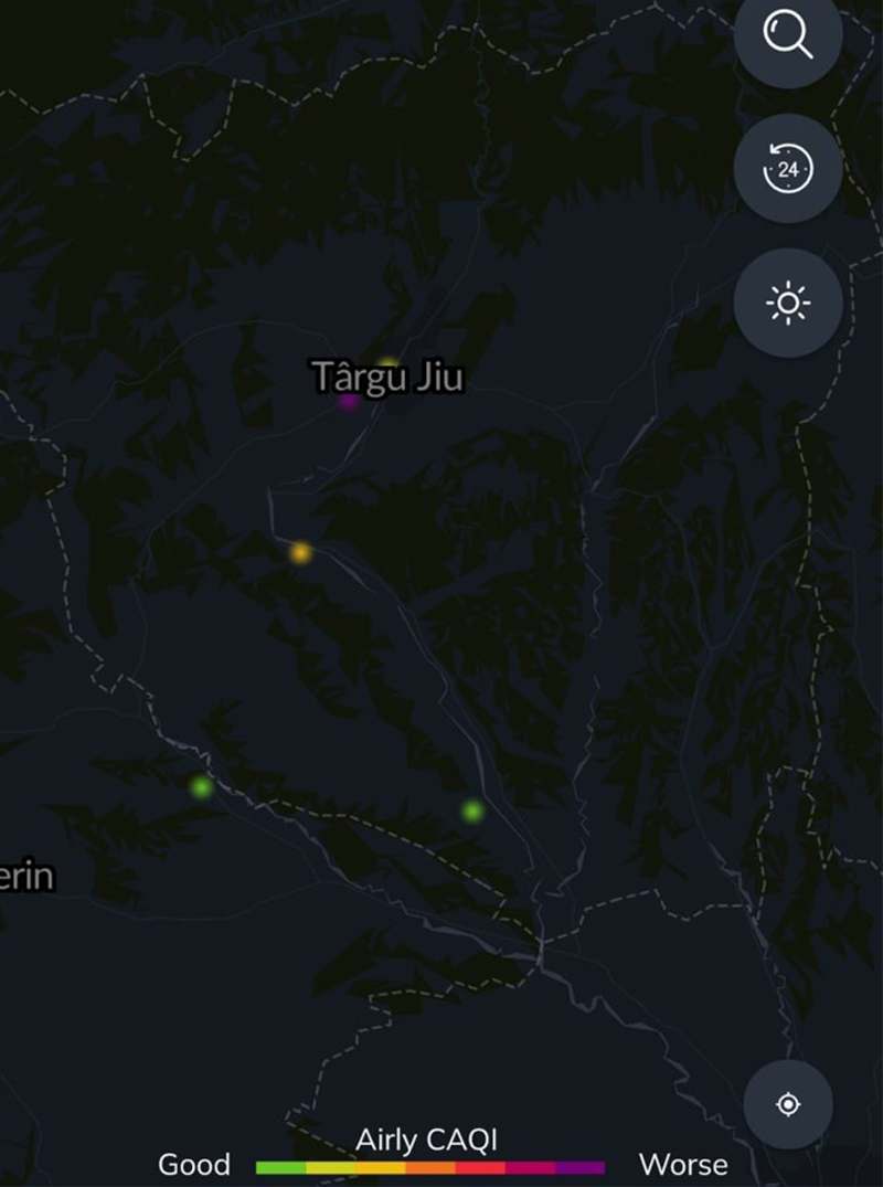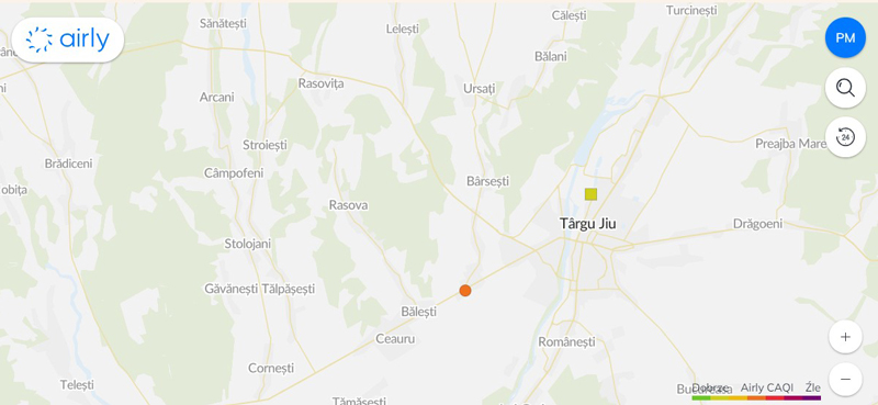 Vineri, 24 decembrie, la orele 18,50, conform datelor furnizate de compania Airly, care se ocupă de monitorizarea calității aerului printr-o rețea de senzori care urmăresc toți markerii cheie de poluare – particule, cel mai poluat loc din România a fost identificat lângă Târgu-Jiu, la Bălești.