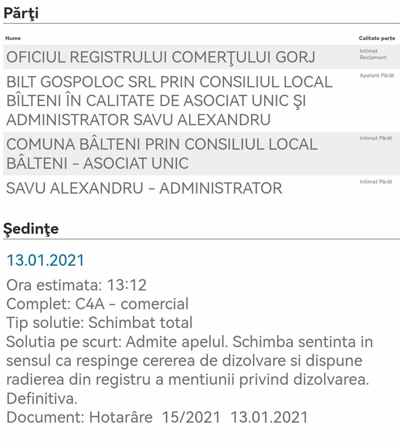 În anul 2020, fostul administrator al SC Bilt Gospoloc Bâlteni, Alexandru Savu a cerut în instanță dizolvarea societății, încercând astfel să se spele pe mâini, însă Curtea de Apel Craiova a dat o decizie definitivă în ianuarie 2021 respingând cererea de dizolvare pe motiv că firma avea deja datorii acumulate către Compania de Apă Oltenia.