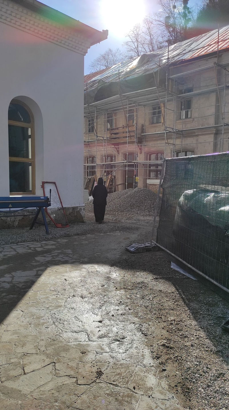 Mănăstirea întreagă este un șantier, peste tot sunt schele, iar magazinul lăcașului de cult a fost mutat la intrare pe domeniul mănăstiresc, la poartă.