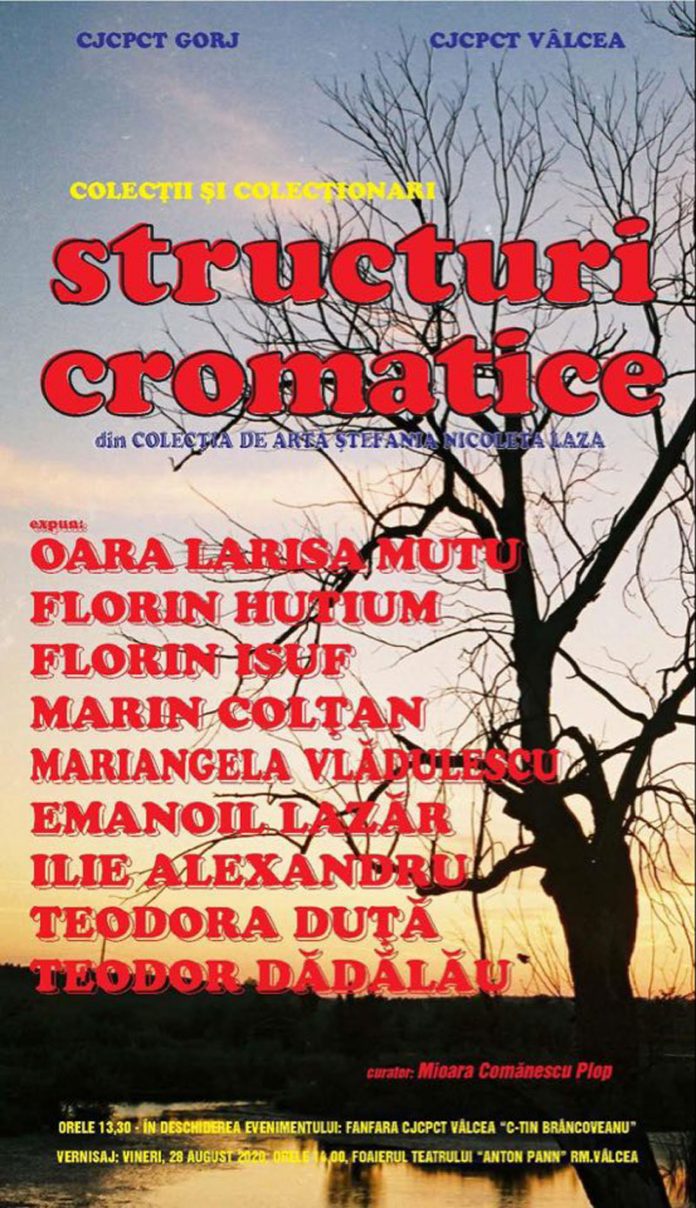 Centrul Județean pentru Conservarea și Promovarea Culturii Tradiționale (CJCPCT) Gorj, în parteneriat cu Centrul Județean pentru Conservarea și Promovarea Culturii Tradiționale Vâlcea, organizează vineri, 28 august 2020, începând cu ora 14.00, vernisajul expoziției „Structuri cromatice” din colecția de artă Ștefania Nicoleta Laza. ,,Continuăm așadar schimbul de experiență între cele două instituții, respectând totuși măsurile impuse în pandemie. Vernisarea expoziției va avea loc în foaierul Teatrului de Stat ,,Anton Pan” din Râmnicu Vâlcea. Colegii noștri de la Vâlcea organizau în fiecare toamnă un salon al artiștilor, însă acum din cauza măsurilor care trebuiesc luate în vederea prevenirii efectelor pandemiei de COVID-19, salonul se va face mai restrâns, cu participarea unui număr mai mic de artiști. Expoziția „Structuri cromatice” va cuprinde două secții: fotografie și pictură. Vă invităm dacă aveți posibilitatea să fiți prezenți la acest duplex artistic care va cuprinde lucrări de colecție ale artiștilor profesioniști: Oara Larisa Mutu Mindoiu, Florin Hutium, Florin Isuf, Marin Colțan, Mariangela Vlădulescu, Emanoil Lazăr, Ilie Alexandru, Teodora Duță, Gelu Costea, Teodor Dădălău. Curatorul expoziției este doamna Mioara Comănescu Plop, consultant artistic CJCPCT Vâlcea”, a anunțat Daniela Gapșea, purtătorul de cuvânt al CJCPCT Gorj. În deschiderea evenimentului organizat la Teatrul de stat Anton Pan va evolua Fanfara Județeană „Constantin Brâncoveanu” a Consiliului Județean Vâlcea. La eveniment va fi prezent profesorul Alin Pavelescu, managerul CJCPCT Vâlcea, dar sunt așteptați toți iubitorii de frumos și cultură.