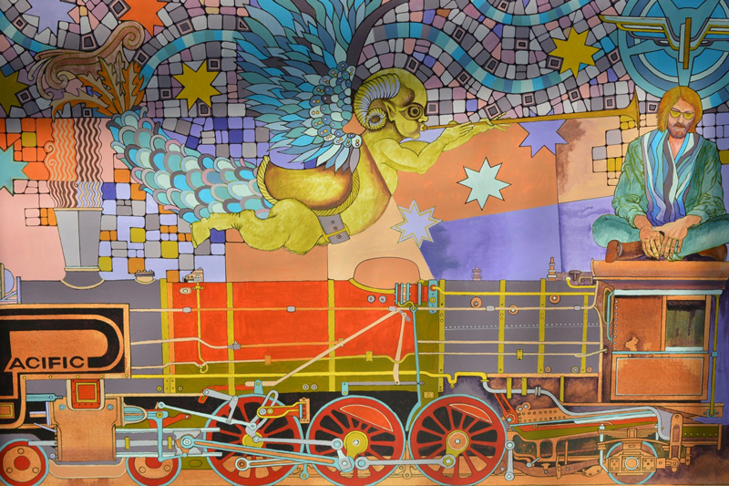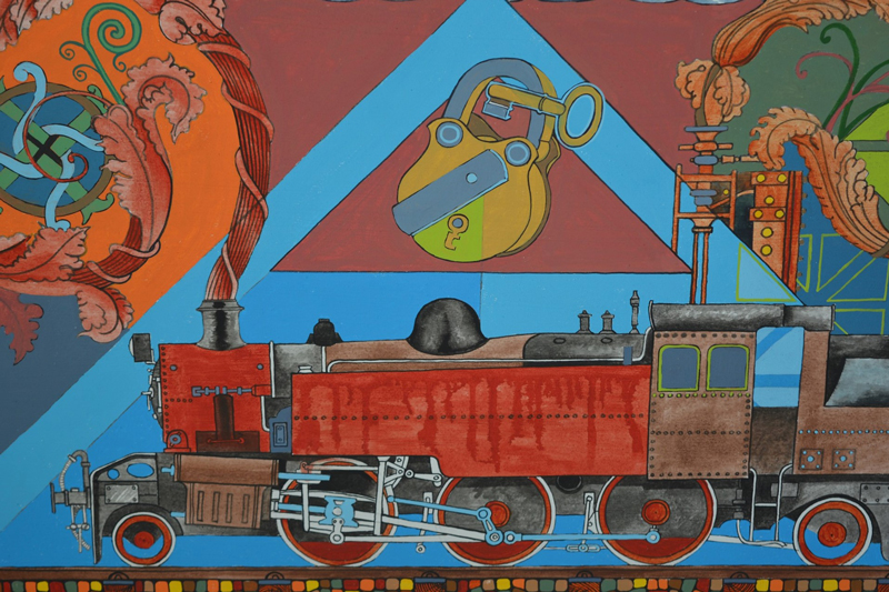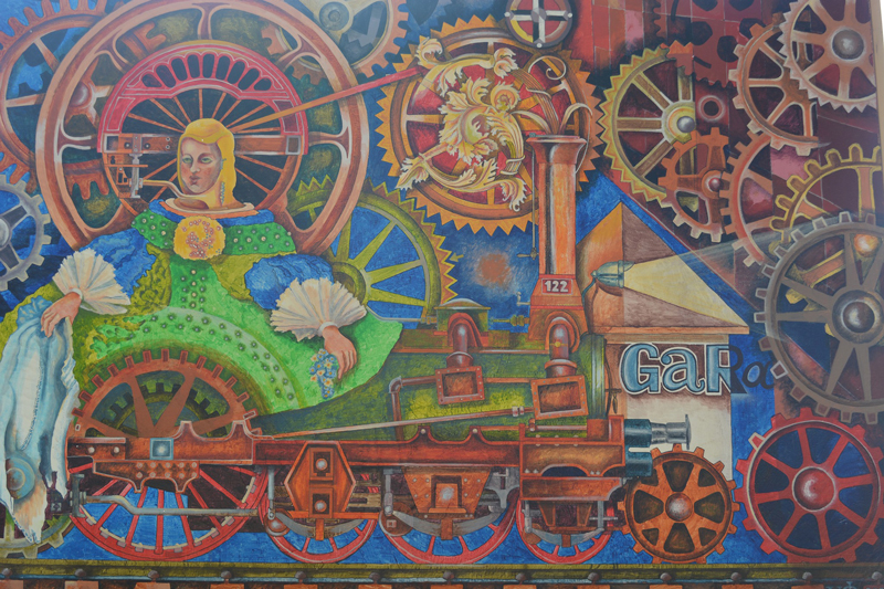 Locomotive din toate timpurile și de mărci încă nedeslușite, vagoane vechi de marfă, drezine pentru plimbat oficialități și delegații în interes de serviciu, vagoane elegante pentru călători veniți din toată lumea, ansamble și subansambluri învechite fără vreo trebuință, piese de schimb gata ruginite, scule de tot felul, semafoare de diverse forme cu geamuri frumos colorate, traverse cu șinele aferente pentru orice ecartament, ceasuri specializate în a da ora exactă pe meridianul nostru, uniforme de ceferiști în timpul serviciului, genți încăpătoare pentru nași, chipiuri de culoarea vișinei putrede pentru șefii de gară, legitimații speciale și câte și mai câte, aranjate pe pânze de mari dimensiuni, în culori asortate ca să facă față unei posibile ceremonii rezervată doar invitaților cu disponibilitate recunoscută pentru o astfel de întâlnire fastuoasă cu arta într-o… Sală de așteptare.