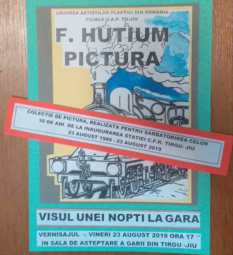 M-am gândit că, într-o astfel de situație, cel mai potrivit pentru o așa ispravă cultural-artistică ar fi pictorul Florin Hutium. Am pus țara la cale împreună și prietenul nostru s-a pus pe treabă și pe 23 august 2019 – la 30 de ani de la inaugurarea gării – ne-a invitat la vernisajul expoziției sale „Visul unei nopți la gară“, cuprinzând lucrări de pictură cât să umple tot etajul.