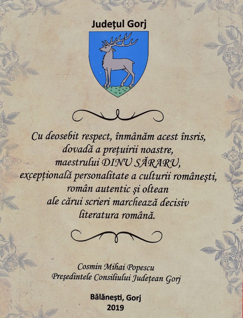 Când te vezi cu domnu Dinu Săraru să-i transmiți numai de bine din toate puterile mele, și-n sănătatea-i de care doresc să se bucure încă mulți ani, dau și io un rând cu vin de-al bun pe terasă la „La Zamfir”, ca să mai stăm amândoi de vorbă și să prefirăm viața.
