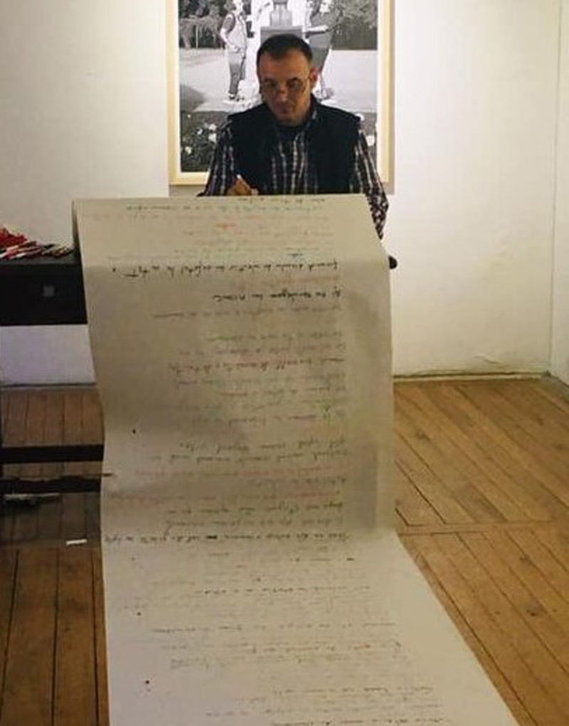 Întâmplarea s-a petrecut de față cu lume multă – prieteni apropiați, scriitori profesioniști, familia toată, mass-media interesată și gură-cască îndrăgostită în timpul liber și de poezie –, în spațiul expozițional al Galeriei Pygmalion, unde Robert Șerban s-a prezentat la fix, conform programului afișat la vedere, având asupra-i un sul de hârtie tipografică – din care „se trag” pe rotativă ziarele – și un braț de creioane de toate culorile. S-a așezat „la birou”, și-a suflecat mânecile salopetei de poet recunoscut de breaslă la nivel național și fără să bage pe nimeni în seamă, parcă ascultând o comandă „de sus”, acompaniat de muze special pregătite și angajate cu ziua, urmare unui contract avantajos ambelor părți, a început să deseneze fără oprire versuri inspirate, parcă vibrând toate sub aripele unei păsări măiestre, fiecare într-o culoare, dovedind spre surprinderea asistenței și a conducerii galeriei, o certă vocație plastică, de o severă rigoare, cu calități demne de luat în seamă, nu lipsite de un anume lirism, care-l legitimează responsabil de-acum și în fața criticii de specialitate.