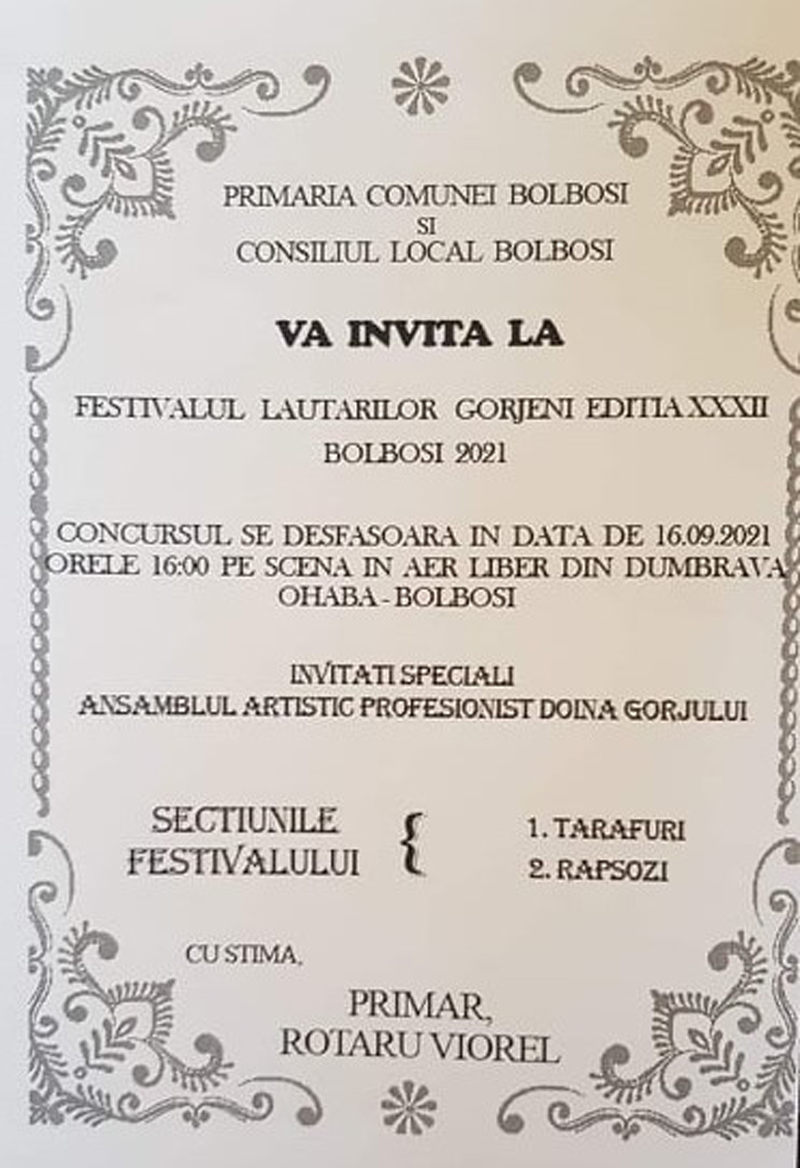 Festivalul lăutarilor gorjeni de la Bolboși și-a desemnat joi, 16 septembrie, câștigătorii. Concursul a avut loc pe scena în aer liber din Dumbrava Ohaba. Festivalul a avut două secțiuni, una rezervată tarafurilor (vârstă minimă 18 ani), iar cealaltă rapsozilor (vârstă minimă 30 de ani). Rapsozii au avut în repertoriu o baladă sau doină și un cântec de joc. Costumul popular a fost obligatoriu.