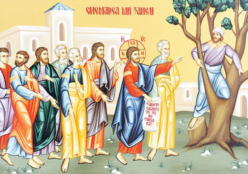 Duminica aceasta, a 32-a după Rusalii, încee cele cinci duminici care vestesc şi pregătesc intrarea în Postul Mare, după cum sunt rânduite astfel: Duminica lui Zaheu vameşul – ce are ca temă, aşa cum am văzut, dorinţa omului păcătos de a-L vedea şi a-L cunoaşte pe Dumnezeu, Duminica vameşului şi a fariseului, care ne arată că virtutea smereniei este începutul drumului spre mântuire şi că numai celor «săraci cu duhul» sau smeriţi, le este dată Împărăţia Cerurilor (Matei 5, 3), Duminica întoarcerii fiului risipitor – în care se insistă pe ideea că Dumnezeu este un Tată bun şi iubitor pentru fiecare om în parte şi că ne aşteaptă cu braţele deschise, chiar dacă, înfruptându-ne din «roşcovele» păcatului, ne-am înstrăinat de El. Urmează Duminica înfricoşătoarei judecăţi, în care se arată că, deşi Dumnezeu ne este un Tată iubitor şi îndelung răbdător, El este în acelaşi timp şi un Drept Judecător, deoarece Pilda înfricoşătoarei judecăţi ne arată că iubirea nemărginită a Lui Dumnezeu presupune, în acelaşi timp, şi un surplus de dreptate, că fiecare dintre noi, vom fi judecaţi de faptele şi pentru faptele noastre, după dreptate, iar ultima este Duminica Izgonirii lui Adam din Rai, numită şi a iertării, aceea în care Biserica ne reaminteşte îndemnul Mântuitorului Hristos, de a aduce jertfa postului «zeciuiala» faptelor bune Lui Dumnezeu, numai după ce am iertat din inimă pe cei care ne-au greşit, ,,Că de nu veţi ierta din inimă celor ce vă greşesc, nici Tatăl vostru nu vă va ierta vouă”! Aşadar, Duminica lui Zaheu vameşul, ne-a adus înaintea ochilor minţii dorinţa omului păcătos de a-L căuta, a-L vedea şi de a-L cunoaşte pe Dumnezeu, aşa cum spunea şi Fericitul Augustin, că «ne-ai făcut pentru Tine, Doamne, şi neliniştită este inima mea până ce se va odihni întru Tine», ca o duhovnicească mulţumire şi o mărturisitoare credinţă! Deci, pornim de la faptul că această mirifică întâmplare petrecută în existenţa pământească a Mântuitorului Iisus Hristos, pe care Sfânta Evanghelie de la Sfântul Evanghelist Luca, la capit. 9, 1-19, ne-o înfăţişează spre duhovnicească zidire, se petrece în oraşul Ierihon, locul unde Mântuitorul era în trecere, fiind înconjurat, ca de obicei, de mulţime de oameni, dornici să vadă cu ochii proprii lucrurile peste fire ce le săvârşea Fiul Lui Dumnezeu. Deci, era o mulţime însetată să-I asculte învăţăturile admirabile, iar în Ierihon trăia un om cu numele de Zaheu, mic de statură, dar, pe cât era de bogat, pe atât era de păcătos. Era mai marele vameşilor, adică, era căpetenia acelora care încasau dările pe care evreii erau datori a le plăti stăpânirii romane, care nu cu mult înainte, îşi întinsese puterea şi asupra pământului sfânt al făgăduinţei. Deşi practica o îndeletnicire dintre cele mai ingrate şi urâte de popor, fiind direct în slujba puterii înrobitoare şi dijmuind mai ales şi cu mai multă asprime pe cei de jos, pe cei mici şi fără apărare, adică pe săraci, pe orfani şi pe văduve, aceasta făcând-o nu atât în folosul vistieriei statului, cât mai ales în cel al pungii proprii, în acest fel explicându-se bogăţia mare a lui, ca şi păcătoşenia nemăsurată, Zaheu fiind, fară îndoială, fruntaş între fruntaşii oraşului, fiindcă era foarte bogat. Se ştia încă de pe atunci că respectul, consideraţia de care te bucurai, poziţia socială pe care o aveai, erau în directă legătură şi proporţie, nu cu cinstea şi omenia vieţii tale, nicidecum cu caracterul pe care-l aveai, nu cu virtutea pe care o practicai şi nici chiar cu ştiinţa şi priceperea de care dădeai dovadă, ci, doar cu averea sau cu starea materială pe care te rezemai, ca şi astăzi, de altfel! La vremea respectivă, fără îndoială că Zaheu va fi auzit despre Mântuitorul Hristos, al cărui nume era rostit cu atâta veneraţie şi devotament de către mulţime şi căruia îi cântau osanale toţi cei mântuiţi din tot felul de neputinţe! Aşadar, în inima rece a acestui bogat înrobit de avere, începe să mijească o dâră de lumină, în sufletul său înrăit de păcate începe să se înfiripe, să încolţească o dorinţă de evadare din rău înspre bine, din păcat spre virtute, deoarece Zaheu, mai marele vameşilor şi păcătosul păcătoşilor, vrea să-L vadă pe Mântuitorul Iisus Hristos. Deşi, această dorinţă a sa pare să nu fie realizabilă, căci el e mic de statură şi atâta lume e strânsă în jurul Mântuitorului, încât e imposibil să-L poată vedea sau să poată străbate până la El, iar, ca să-şi potolească imboldul lăuntric şi tainic ce-l mâna spre Mântuitorul, fără să ţină seama că nu se cădea ca el, Zaheu, marele bogătaş, el, omul respectat şi cinstit de către concetăţenii săi, el, om în toată firea, să re¬curgă la expediente copilăreşti pentru a-şi atinge scopul. Deci, ştiind pe unde avea să treacă Mântuitorul Iisus, Zaheu negăsind alt chip spre a-L vedea, se suie într-un sicomor, adică, într-un dud, cum am spune noi, ca să-L vadă pe Domnul, căci pe acolo avea să treacă. Prin urmare, călcând în picioare orgoliul personal de om matur, de om bogat şi cu vază, nesocotind judecata oamenilor, care pe bună dreptate ar fi râs de el, văzându-l cocoţat în pom, asemenea pruncilor – Zaheu îşi potoleşte dorul năvalnic al sufletului de a-L cunoaşte pe Iisus Hristos. Deci, văzându-l în pom, privindu-l cu atâta dor şi cu atâta iubire, Mântuitorul îi spune: ,,Zahee, grăbeşte de te pogoară, căci astăzi, în casa ta trebuie să rămân”! Deducem, în acest fel, că Mântuitorul nu putea trece nepăsător prin faţa unui om care dorea atât de mult să-L cunoască şi în sufletul căruia încolţise speranţa izbăvirii din păcate, mai ales că Zaheu era