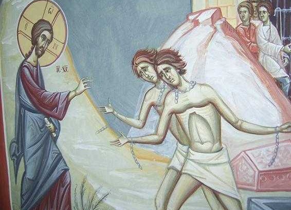 În Duminica a 5-a după Rusalii, Ap. Romani 10, 1-10; Ev. Matei 8, 28-34; 9,1 (Vindecarea celor doi demonizaţi din ţinutul Gadarei), la Sfânta şi Dumnezeiasca Liturghie avem Pericopa Evanghelică în care vedem cum Hristos Domnul, îi învaţă pe oameni, nu doar prin ceea ce spune, ci şi prin ceea ce face, pentru că în fiecare gest al Său, în fiecare faptă a Lui, există o mulţime de înţelesuri duhovniceşti, o mulţime de lumini spirituale pentru luminarea sufletului nostru, aceasta fiind o tulburătoare pildă, pentru că ne arată atitudinea demonilor faţă de oameni şi a oamenilor unii faţă de alţii, dar, mai vedem şi faptul că demonii care îi chinuiesc pe oameni, îi folosesc pe aceştia ca să chinuiască şi ei pe alţi oameni, la rândul lor, mai ales că din mândrie şi printr-o neascultare de Dumnezeu au decăzut din îngeri şi au devenit demoni sau duhuri rele, iar smerenia iubirii atotputernice a Lui Hristos Cel răstignit şi Înviat, îi înfricoşează pe demoni, cei care nu au smerenie şi nici iubire faţă de Dumnezeu, ca dovadă că lucrarea de vindecare a sufletului de păcate şi de patimi cuprinde în ea o luptă duhovnicească între Duhul Lui Hristos, primit de creştini la Botez, şi duhurile rele, care îl urăsc pe omul credincios, însă, Mântuitorul Iisus Hristos doreşte vindecarea oamenilor şi adunarea lor în comuniune de iubire cu Dumnezeu!