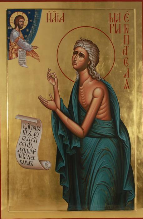 Aşadar, Duminica a 5-a din Post este numită şi a Cuvioasei Maria Egipteanca, această pildă de curaj în lupta dusă cu patimile cele mai grele, având, astfel, posibilitatea să aflăm că biografia acestei preaminunate sfinte femei a fost scrisă de către Sfântul Sofronie, Patriarhul Ierusalimului. Astfel, odată, în timpul Sfântului şi Marelui Post, un anume ieromonah, Avva Zosima, s-a retras în pustia cea mai dinlăuntru, cea de dincolo de Iordan, cale de douăzeci de zile de mers. Deodată, el a zărit silueta unei fiinţe omeneşti, goală, cu pielea trupului zbârcită foarte şi cu părul alb strălucitor, ca lâna, iar aceasta zărindu-1 de departe, a început să fugă de la faţa părintelui, care, însă, a alergat şi el după acea fiinţă cât a putut de repede, până când femeia, oprindu-se la un râu, a strigat tare: «Avva Zosima, iartă-mă pentru Domnul! Dar nu pot vedea faţa ta căci femeie sunt, şi sunt goală!». Atunci, bătrânul Zosima şi-a scos straiul de pe deasupra şi 1-a aruncat femeii care, înfăşurându-se cu el, a ieşit din ascunzişul în care intrase. Bătrânul s-a înspăimântat văzând că acea femeie necunoscută din pustie îl strigă pe nume. Rugându-se de ea cu lacrimi să nu-i ascundă nimic din istoria ei, căci Dumnezeu îl trimisese spre povăţuire şi înţelepţire în pustia aceea, femeia i-a povestit care a fost viaţa ei. Ea se născuse în Egipt, şi începuse să ducă o viaţă plină de desfrânări în Alexandria, încă de la vârsta de doisprezece ani. Într-o astfel de necurată viaţă a trăit ea timp de şaptesprezece ani şi mânată de poftele nestăpânite ale trupului ei, s-a îmbarcat odată într-o corabie care avea destinaţia Ierusalim. Ajungând în Sfânta Cetate, a voit să meargă şi să se închine şi ea Lemnului Sfintei de viaţă făcătoarei şi Cinstitei Cruci, dar o putere nevăzută o împiedica să intre în biserică. Atunci, cuprinsă de spaimă, ea a privit către icoana Preasfintei Născătoare de Dumnezeu, din naos, şi năpădită de silă şi de ruşine faţă de toată ticăloasa şi necurata ei viaţă, s-a rugat Maicii Domnului să o lase să se apropie şi ea de Lemnul Sfintei Cruci şi să i se închine, făgăduind Maicii Domnului că de aici înainte, va face cum îi va porunci ea, şi se va duce oriunde Preacurata îi va spune. Atunci, puterea nevăzută, nu a mai împiedicat-o să intre în biserică şi să îşi împlinească dorinţa, închinându-se Cinstitului Lemn. Maria s-a întors în naos şi a mulţumit cu lacrimi Maicii Domnului că a ascultat ruga ei, a preapăcătoasei. În acel moment a auzit un glas care i-a zis: «Du-te dincolo de Iordan şi vei afla acolo adevărata pace»! Femeia şi-a cumpărat trei pâini şi a pornit spre Iordan, unde a ajuns în aceeaşi seară. În ziua următoare a primit Sfânta Împărtăşanie în Mănăstirea Sfântului loan, după care a trecut de cealaltă parte a Râului Iordan şi a rămas în acea pustie timp de patruzeci şi şapte de ani, fără să iasă de acolo niciodată, pentru nici o trebuinţă, chinuindu-se de mari şi multe spaime, şi de gândurile cele de desfrânare, ca şi de nişte fiare sălbatice. Ea se hrănea cu verdeţuri din pustie. Deci, terminându-şi de istorisit viaţa către Avva Zosima, ea s-a dus puţin mai încolo, stând la rugăciune, iar bătrânul a văzut atunci cum femeia se înalţă uşor în văzduh. După rugăciune, femeia 1-a rugat să vină din nou în anul următor la acelaşi loc al ţărmului Iordanului şi să aducă cu el şi Sfânta Împărtăşanie, căci ea va fi acolo, dorind să se cuminece cu Sfintele Lui Hristos Taine, după patruzeci şi opt de ani. Bătrânul a venit negreşit în următorul an cu Sfânta Împărtăşanie şi cu un coş de merinde pentru Sfânta, la acelaşi loc de pe malul Iordanului, întrebându-se, cum va face să-i ducă Sfânta Împărtăşanie, căci iată, nu era luntre ca să treacă dincolo de apa Iordanului.