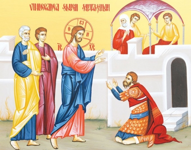 Am avut la Sfânta şi Dumnezeiasca Liturghie, în Duminica a 4-a după Rusalii, (a Sf. Părinţi de la Sinodul al IV-lea Ecumenic) Ap. Romani 6, 18-23; Ev. Matei 8, 5-13 (Vindecarea slugii sutaşului); Ioan 17, 1-13 (Rugăciunea lui Iisus), Pericopa Evanghelică de la Sfântul Evanghelist Matei, cap. 8, vers. 5-13, în care se prezintă minunea vindecării slugii sutaşului, un prilej de învăţătură pentru a desluşi modul cum sutaşul roman a cerut de la Hristos ca să-l tămăduiască pe slujitorul său, care era ţintuit la pat (v. Matei 8, 5-13), iar Domnul i-a zis să vină în casa lui ca să-l vindece. Credinţa puternică în Dumnezeirea Lui Iisus şi dragostea fierbinte faţă de omul aflat în suferinţă, de a cărui însănătoşire se îngrijeşte întocmai ca şi pentru un frate al său, ne impresionează la sutaşul acesta, ca şi rugăciunea pentru sluga sa. Să luăm aminte şi noi, dacă putem pretinde că ne rugăm cu aceeaşi vrednicie, nu pentru aproapele, ci, pentru cei din familia noastră! Pentru că sutaşul s-a rugat pentru slujitorul lui şi devine impresionantă credinţa atât de puternică a acestui păgân! Aşadar, să învăţăm de la el, să ne rugăm, pentru că este de folos şi primeşte Dumnezeu rugăciunea noastră din sfânta biserică, inclusiv, pentru cei care nu vin cu noi la rugăciune. Pe lângă aceasta, să avem credinţă, pe cât de simplă, pe atât de puternică, și să căutăm la smerenia sutaşului!