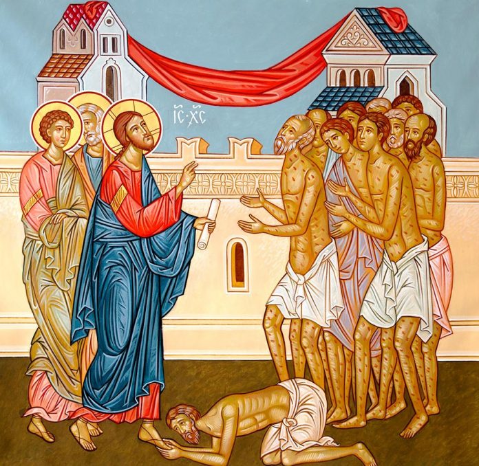 Aşadar, la Sfânta Liturghie a Duminicii a 29-a după Rusalii, prin relatările Sfântului Evanghelist Luca, ni se arată că «În vremea aceea, intrând Iisus într-un sat, L-au întâmpinat zece bărbaţi leproşi, care au stat departe şi care au ridicat glasul, zicând: «Iisuse, Învăţătorule, miluieşte-ne» şi văzându-i, Mântuitorul le-a zis: “Duceţi-vă şi vă arătaţi preoţilor”. Dar, pe când ei se duceau, s-au curăţit. Iar unul dintre ei, văzând că s-a vindecat, s-a întors, cu glas mare slăvind pe Dumnezeu. Şi a căzut cu faţa la pământ la picioarele lui Iisus, mulţumindu-I. Iar acela era samarinean. Şi răspunzând, Iisus a zis: “Oare nu zece s-au curăţit? Dar cei nouă unde sunt? Nu s-a găsit să se întoarcă să dea slavă lui Dumnezeu decât numai acesta care este de alt neam”? Şi i-a zis: “Ridică-te şi du-te! Credinţa ta te-a mântuit!”». Desigur, evenimentul întâlnirii Lui Hristos cu cei zece leproşi urmat de vindecarea minunată a acestora este relatată numai de Sfântul Luca, dar, este foarte probabil ca el să fi primit informaţia chiar de la beneficiarul acestei vindecări, adică, de la străinul (samarineanul) care în mod cert a devenit unul dintre fiii Bisericii primare, încât Luca, şi în calitatea sa de medic, s-a simţit obligat moral să imortalizeze în scris minunea, dar şi ca să le arate samarinenilor, foarte ostili fraţilor lor iudei, că mântuirea vine prin Cineva de neam iudeu (In. 4, 22). În acest fel, Sf. Ev. Luca vrea să accentueze faptul că Mântuitorul Iisus Hristos s-a adresat mai întâi neamului Său, adică iudeilor, în al doilea rând samarinenilor care erau înrudiţi cu iudeii, cu toate că aceştia se amestecaseră cu păgânii, motiv pentru care pe cel vindecat Hristos îl numeşte străin. Abia după aceea, Iisus Hristos îi va îndemna pe ucenicii Săi să se adreseze şi păgânilor, adică «neamurilor» (Mt. 19, 18-20). Prin urmare, Dumnezeiasca Evanghelie, ne împărtăşeşte o vindecare trupească a celor zece leproşi, iar unul dintre cei zece vindecaţi, aşa cum ne încredinţează textul Evanghelic, s-a vindecat şi sufleteşte. E bine ca întotdeuna, să mulţumim pentru cele bune şi pentru cele rele, să fim recunoscători şi unuia şi altuia, pentru că avem în viaţă nevoie unul de altul, să le fim recunoscători sfinţilor, pe care îi tot rugăm ca să intervină la Dumnezeu pentru noi, nevrednicii, să-I fim recunoscători Maicii Domnului, care pururea se roagă şi intervine pentru noi, să fim recunoscători pentru binefacerile date de Dumnezeu, dar şi pentru cele rele pe care le-a trimis asupra noastră, pentru că şi acestea ne sunt de mare folos. Putem desluşi faptul că acest singur vindecat recunoscător, văzând că boala cea înfricoşată s-a luat de la dânsul, şi-a tras sufletul scăpat prin minune din strânsoarea chinului de şerpi veninoşi, iar primul său gând a fost să-I mulţumească Celui ce l-a scos din stricăciunea sa cea nespusă. Iar, precum, doar cu puţin mai înainte, strigase cu buzele roase de lepră: «Iisuse, învăţătorule, fie-Ţi milă de noi», aşa şi acum, a ridicat glasul şi a strigat cu putere, mulţumind Lui Dumnezeu, alergând spre Binefăcătorul său ca să-I mulţumească.