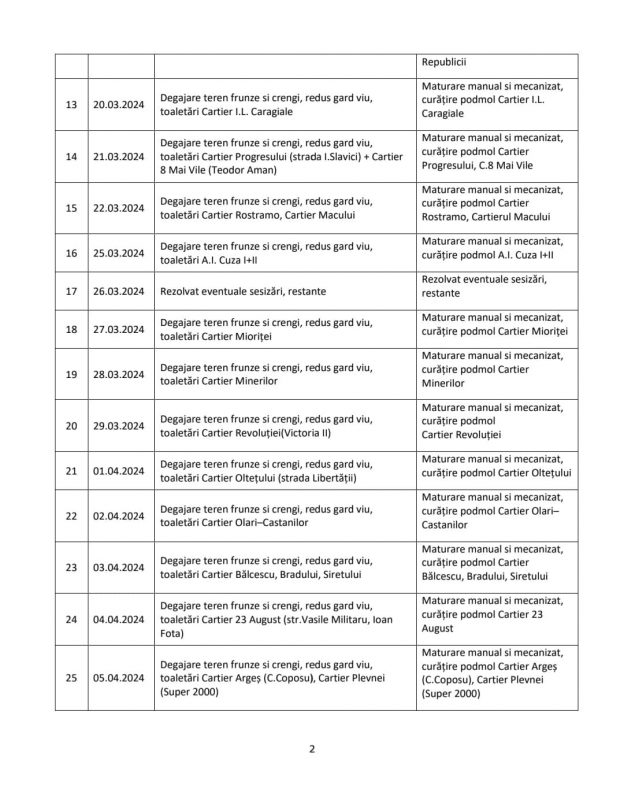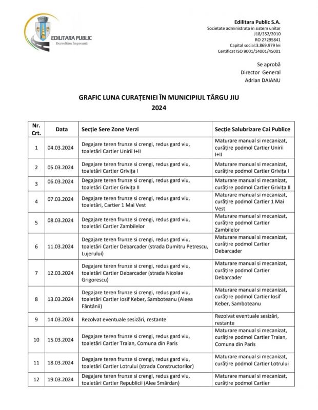 De săptămâna viitoare începe „Luna Curățeniei” la Târgu Jiu, perioadă în care angajații Edilitara Public vor fi în teren, în toate cartierele municipiului, pentru lucrările specifice începutului de primăvară.