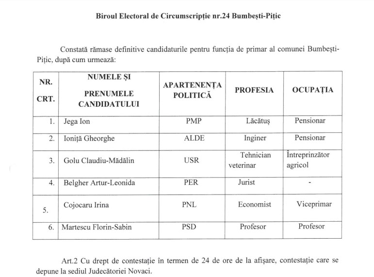 De la USR candidează întreprinzătorul agricol Claudiu Mădălin Golu, de profesie tehnician veterinar. Și-a mai depus candidatura și fostul consilier local din Alimpești, Artur Leonida Belgher, din partea PER. Jurist de profesie, Belgher nu are un loc de muncă în prezent.