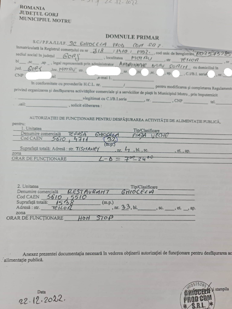 Ilegalitatea în care funcționează firma, legat de ocuparea abuzivă a domeniului public, este recunoscută chiar de firma Ghiocela Prod Com SRL care, pe data de 30 martie 2023, cere aprobare pentru locația din strada Tismana, nr.4, pentru ocuparea unui teren aparținând domeniului privat al municipiului Motru, în suprafață de 120,12 mp, în perioada aprilie-noiembrie, în vederea amplasării unei terase sezoniere.