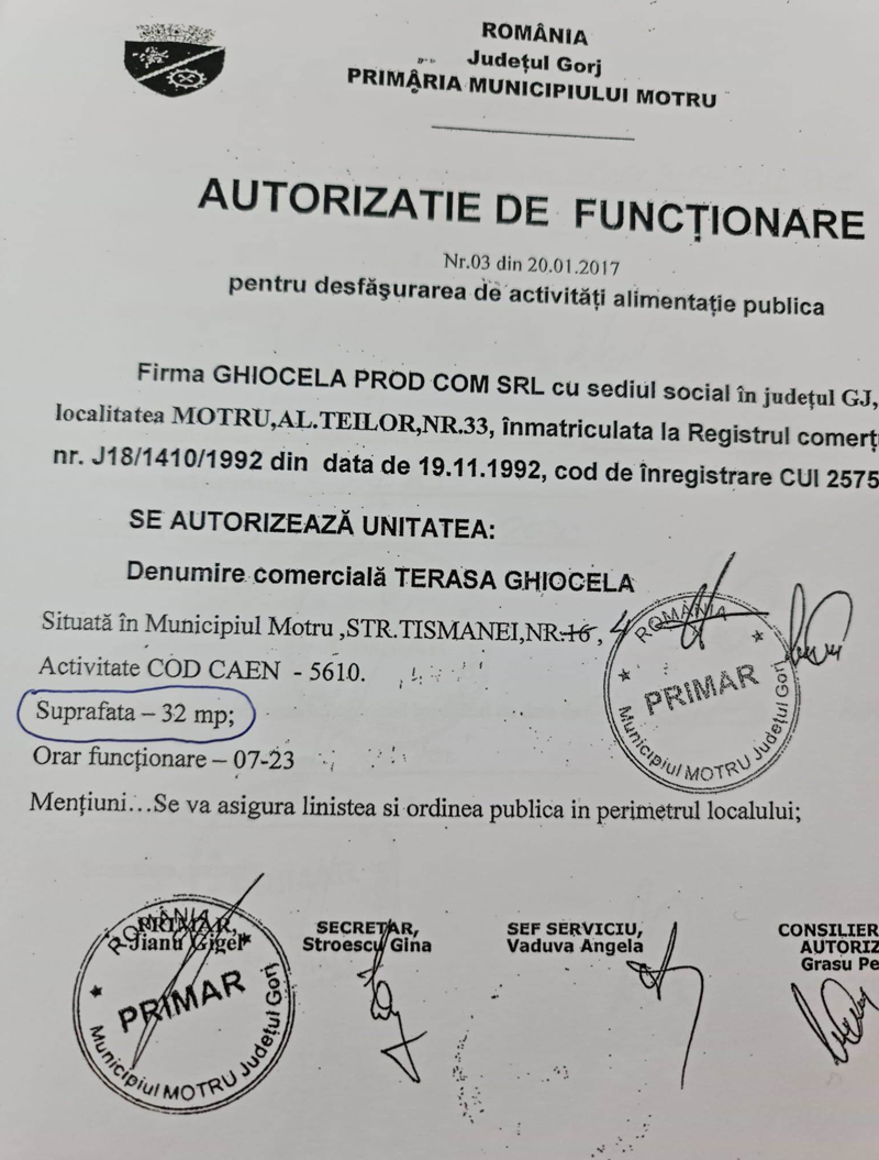 Primul punct de lucru al SC Ghiocela Prod Com SRL Motru a rămas, de ieri, fără autorizația de funcționare, eliberată de Primăria Motru în 2017, prelungită de către deținător, anual. Autoritatea locală a constatat, luni, că societatea își desfășura activitatea pe un spațiu mult mai mare decât era legal. Practic, în acte, firma a solicitat și obținut aviz de funcționare pentru un magazin mixt, de 26 de mp, și o autorizație de funcționare pentru o terasă, de 32 mp. În schimb, aceasta a ocupat și a desfășurat activitate pe o suprafață de peste 200 mp, restul terenului fiind domeniu public. Odată cu anularea autorizației și luarea la cunoștință, firma este obligată să-și închidă activitatea până la rezolvarea acestei probleme, iar primăria să informeze DSP, DSCSA, ANF și Camera de Comerț pentru această situație. Societatea este acuzată că a prejudiciat și bugetul local, având în vedere că. la taxe și impozite locale, aceasta figurează, conform propriei declarații, cu 57 de mp, pentru care a achitat anual o sumă modică.