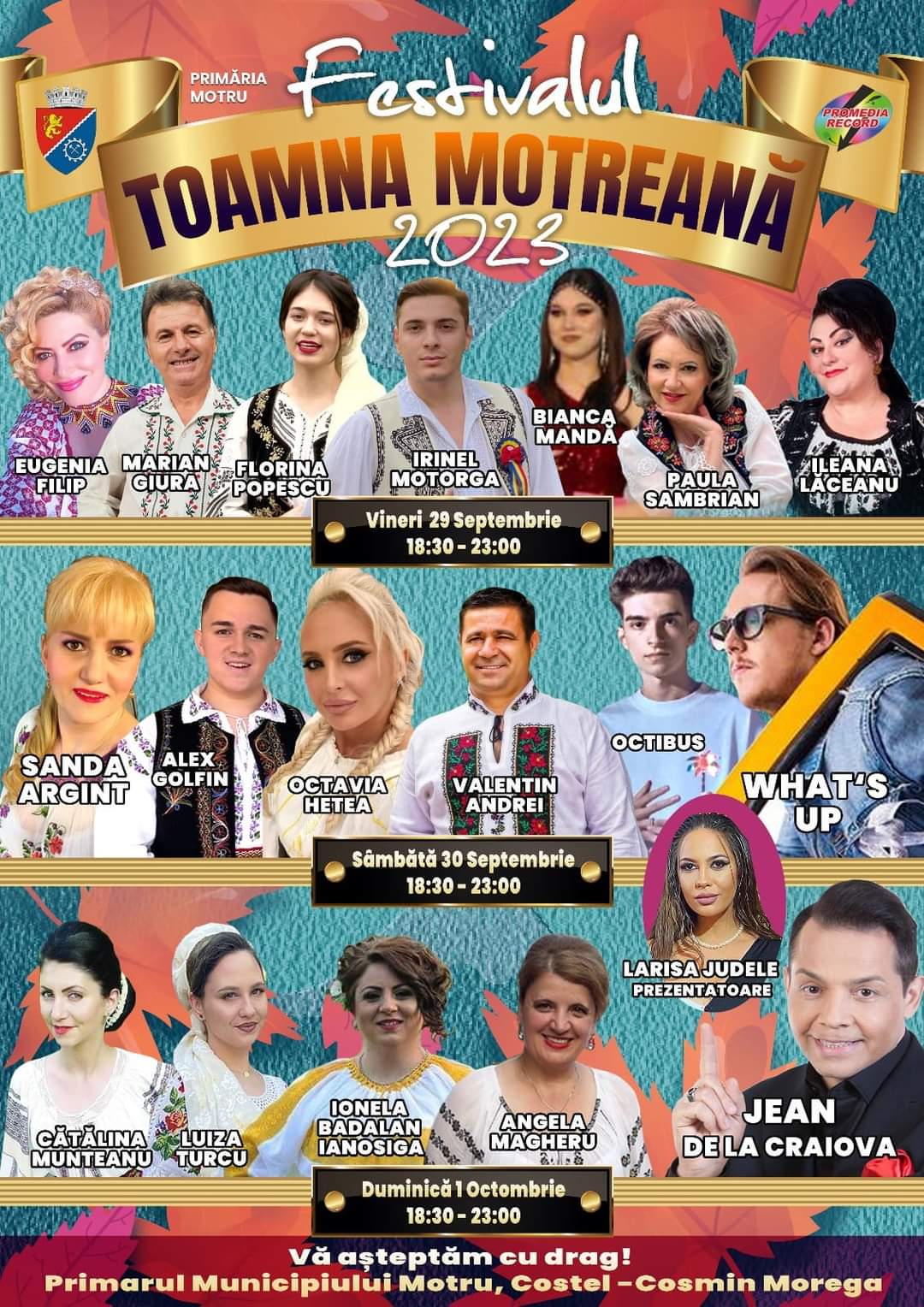 Primăria Municipiului Motru organizează la finalul acestei săptămâni Festivalul Toamna Motreană. Mai multe spectacole vor avea loc în serile de 29 și 30 septembrie, precum și duminică, 1 octombrie. Printre invitații care vor concerta la Motru se numără: Eugenia Filip, Irinel Motorga, Sanda Argint, Valentin Andrei, Jean de la Craiova, What’s Up, și mulți alții.