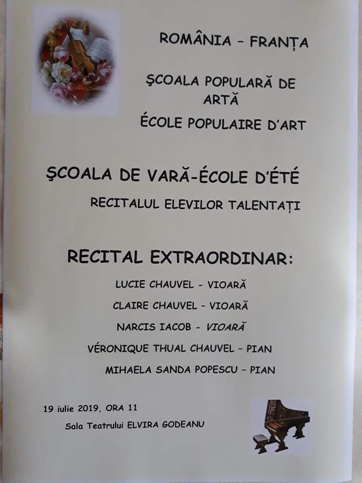 Vineri, 19 iulie 2019, Școala de Vară, parteneriat român-francez, între Școala Populară de Artă Târgu Jiu și pianista Veronique Thual Chauvel-Bretania, își încheie cursurile, cu spectacolul talentaților săi absolvenți. De la vârsta preșcolară, până la 16-17 ani, vom asista la o diversitate interpretativă, o certă afirmare a talentului, într-o lume în care, mai mult ca oricând, avem nevoie de frumoase exemple de talent și perseverență.